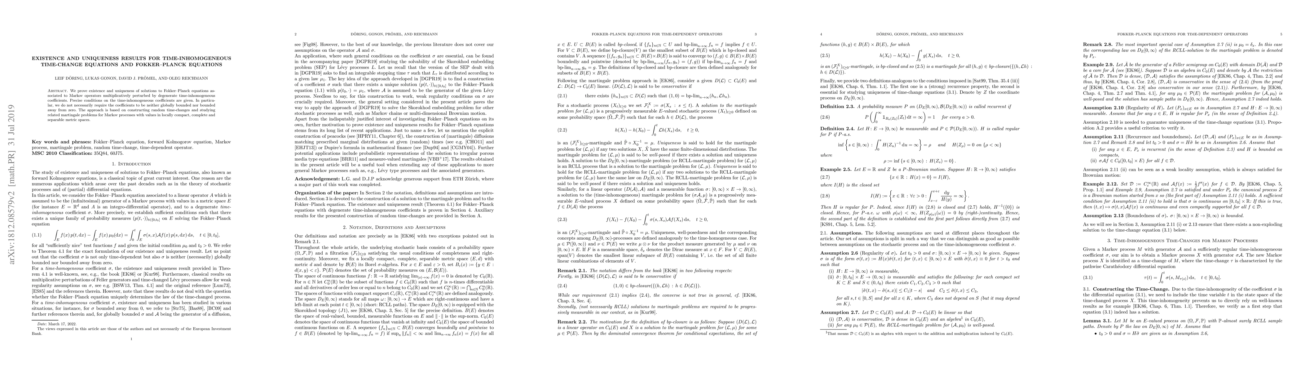 We prove existence and uniqueness of solutions to Fokker--Planck equations associated to Markov operators multiplicatively perturbed by degenerate time-inhomogeneous coefficients. Precise conditions on the time-inhomogeneous coefficients are given. In particular, we do not necessarily require the coefficients to be neither globally bounded nor bounded away from zero. The approach is based on constructing random time-changes and studying related martingale problems for Markov processes with values in locally compact, complete and separable metric spaces.