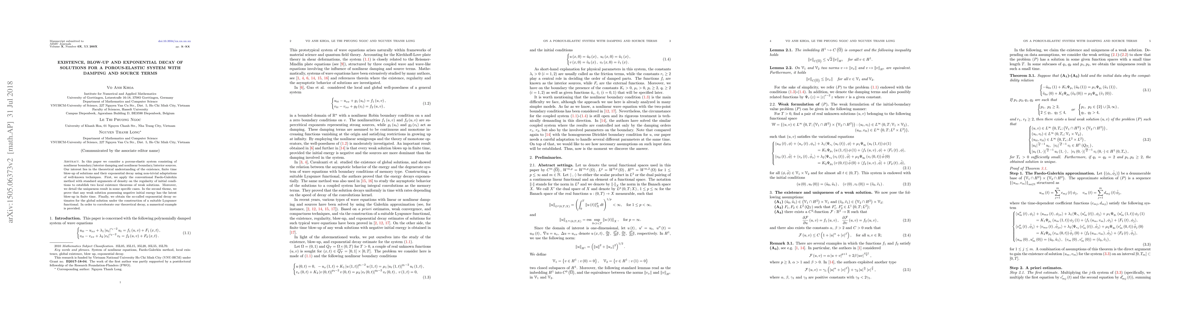 This paper investigates a porous-elastic system with damping and source terms, establishing local existence and uniqueness of weak solutions, and proving finite-time blow-up for solutions with negative initial energy. It also derives exponential decay estimates for global solutions using a Lyapunov functional, supported by a numerical example.