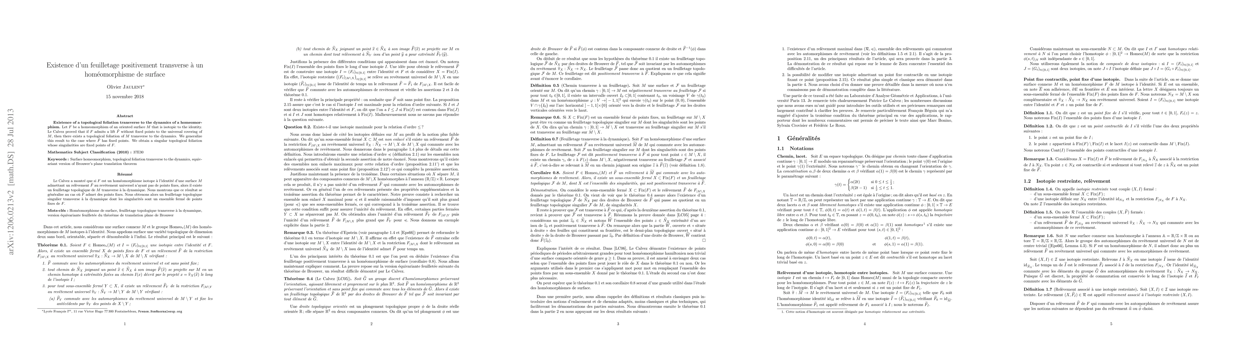 Let F be a homeomorphism of an oriented surface M that is isotopic to the identity. Le Calvez proved that if F admits a lift without fixed points to the universal covering of M, then there exists a topological foliation of M transverse to the dynamics. We generalize this result to the case where the lift of F has fixed points. We obtain a singular topological foliation whose singularities are fixed points of F. Le Calvez a montr\'e que si F est un hom\'eomorphisme isotope \`a l'identit\'e d'une surface M admettant un rel\`evement au rev\^etement universel n'ayant pas de points fixes, alors il existe un feuilletage topologique de M transverse \`a la dynamique. Nous montrons que ce r\'esultat se g\'en\'eralise au cas o\`u le rel\`evement de F admet des points fixes. Nous obtenons alors un feuilletage topologique singulier transverse \`a la dynamique dont les singularit\'es sont un ensemble ferm\'e de points fixes de F.
