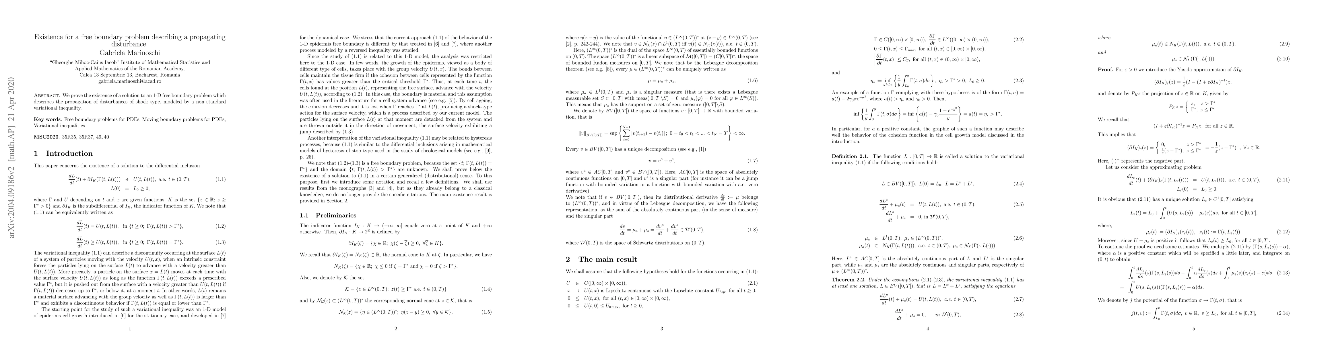 We prove the existence of a solution to an 1-D free boundary problem which describes the propagation of disturbances of shock type, modeled by a non standard variational inequality.