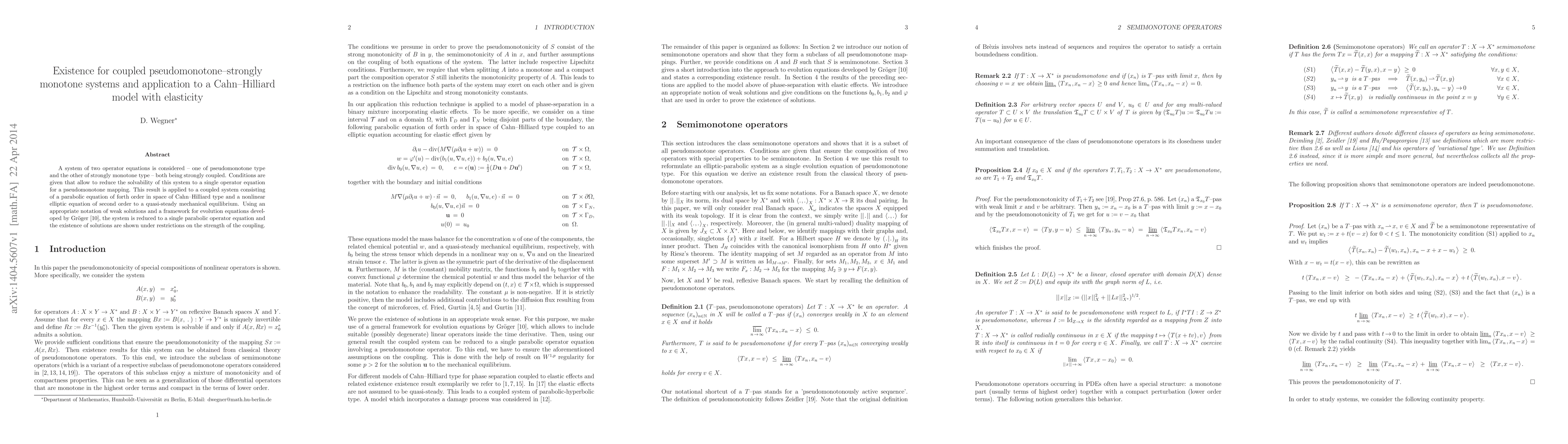 A system of two operator equations is considered - one of pseudomonotone type and the other of strongly monotone type - both being strongly coupled. Conditions are given that allow to reduce the solvability of this system to a single operator equation for a pseudomonotone mapping. This result is applied to a coupled system consisting of a parabolic equation of forth order in space of Cahn-Hilliard type and a nonlinear elliptic equation of second order to a quasi-steady mechanical equilibrium. Using an appropriate notation of weak solutions and a framework for evolution equations developed by Gr\"oger, the system is reduced to a single parabolic operator equation and the existence of solutions are shown under restrictions on the strength of the coupling.