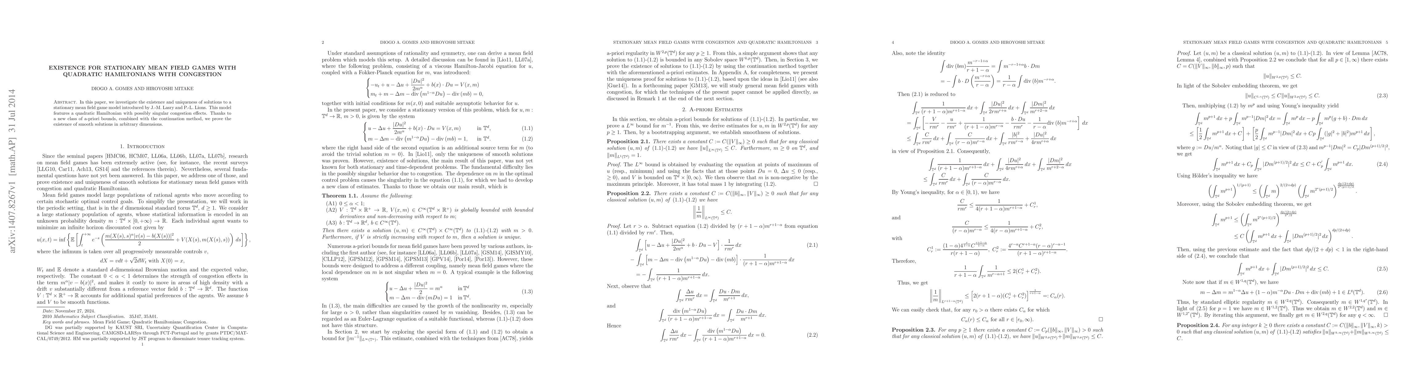 This paper proves the existence and uniqueness of smooth solutions for a stationary mean field game model with quadratic Hamiltonians and congestion effects, utilizing new a-priori bounds and the continuation method in any dimension.
