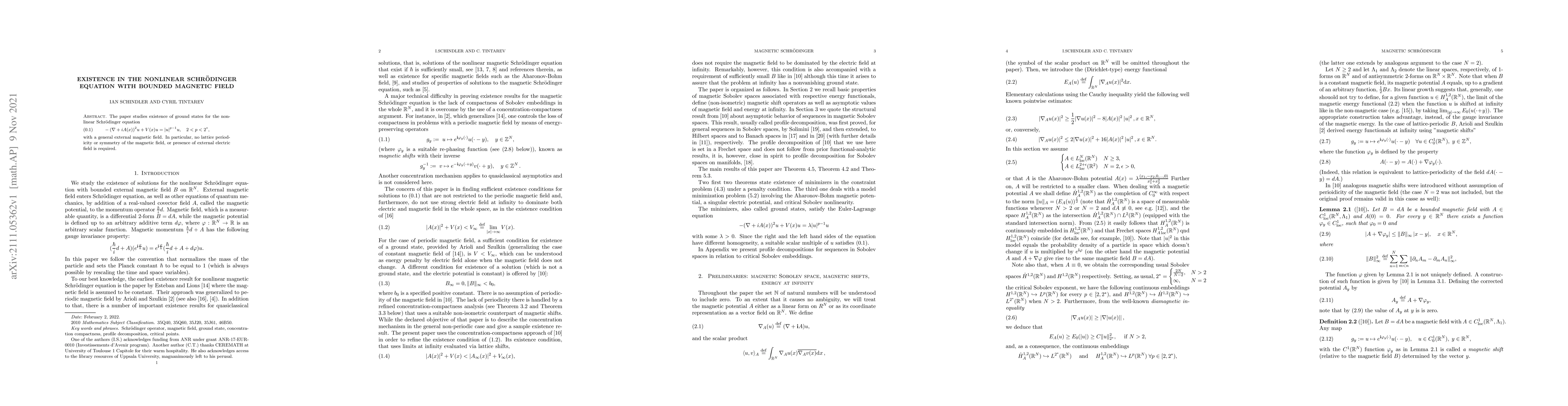 Summary: This paper investigates the existence of ground states for the nonlinear Schrödinger equation under a bounded magnetic field, without requiring lattice periodicity, symmetry, or external electric fields. The focus is on establishing the fundamental solutions under general magnetic conditions.