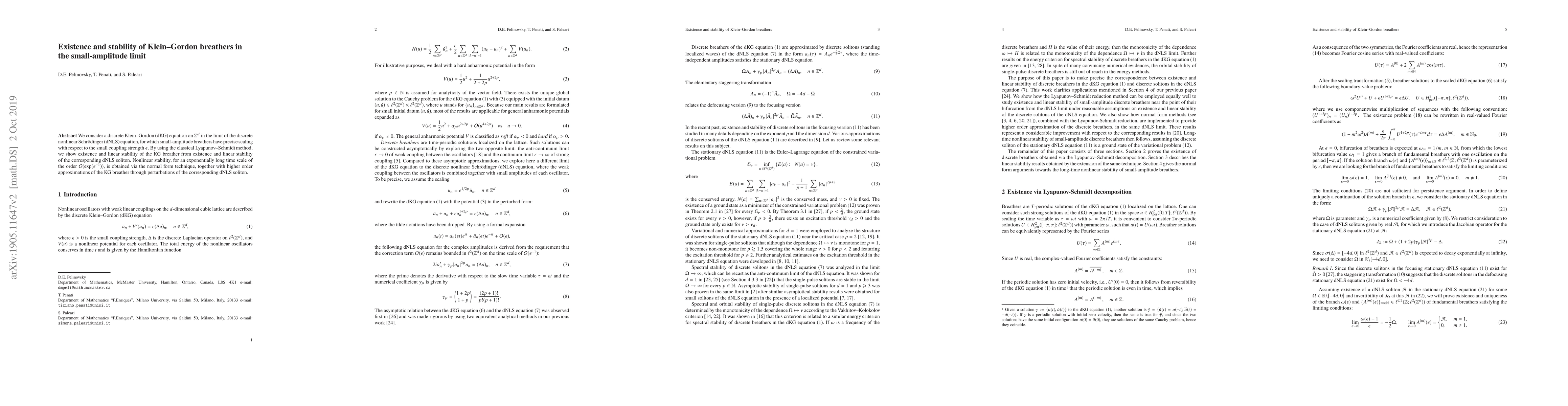 In this paper we consider a discrete Klein-Gordon (dKG) equation on $\ZZ^d$ in the limit of the discrete nonlinear Schrodinger (dNLS) equation, for which small-amplitude breathers have precise scaling with respect to the small coupling strength $\eps$. By using the classical Lyapunov-Schmidt method, we show existence and linear stability of the KG breather from existence and linear stability of the corresponding dNLS soliton. Nonlinear stability, for an exponentially long time scale of the order $\mathcal{O}(\exp(\eps^{-1}))$, is also obtained via the normal form technique, together with higher order approximations of the KG breather through perturbations of the corresponding dNLS soliton.