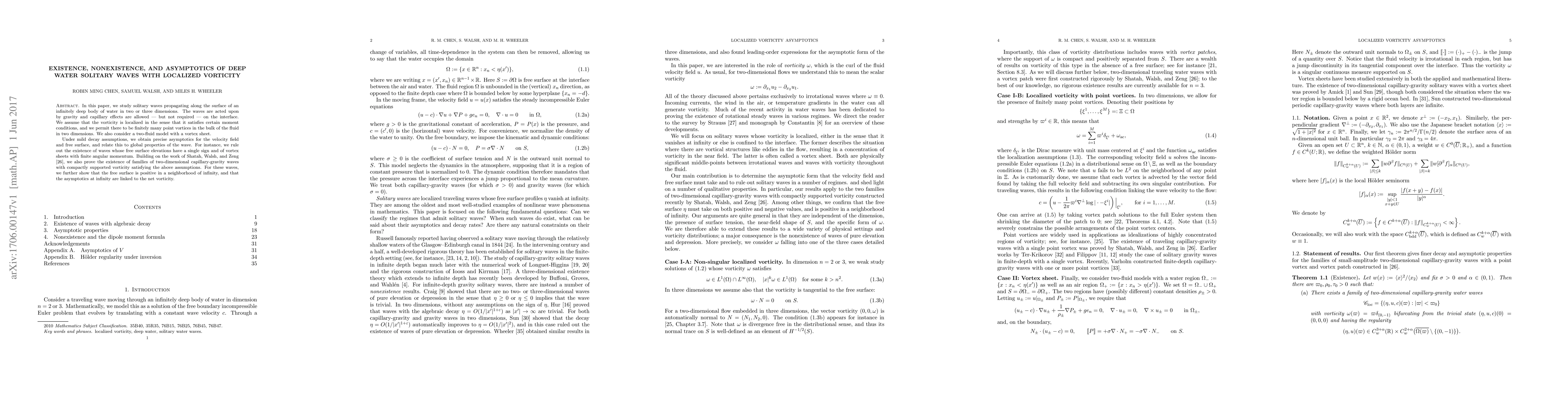 This paper investigates the existence and nonexistence of deep water solitary waves with localized vorticity, proving the existence of families of capillary-gravity waves with compactly supported vorticity and ruling out waves with single-sign elevation and finite angular momentum vortex sheets. It also provides precise asymptotics for the velocity field and free surface.