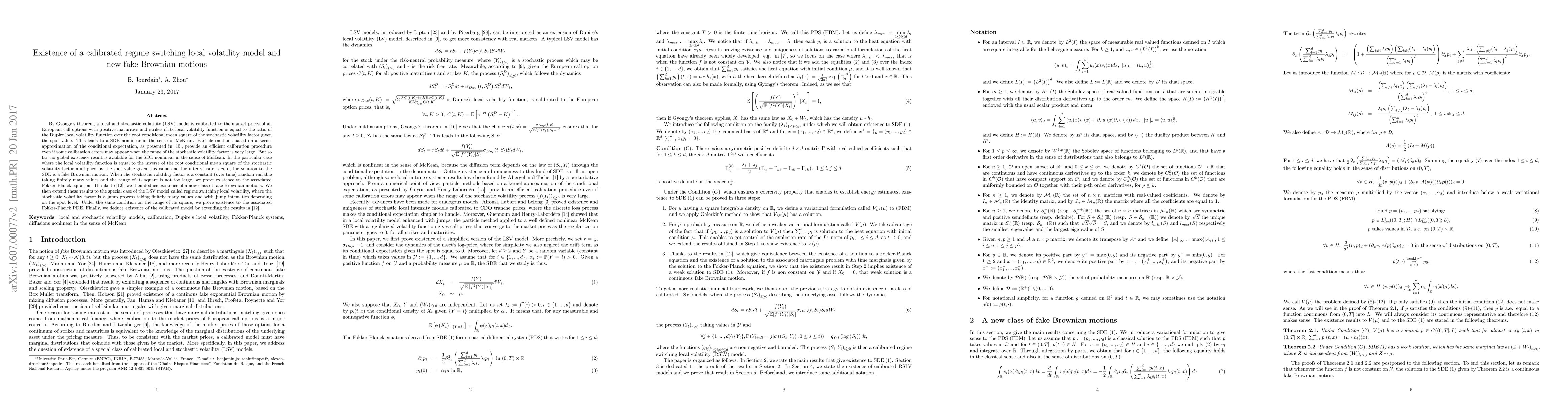 By Gyongy's theorem, a local and stochastic volatility (LSV) model is calibrated to the market prices of all European call options with positive maturities and strikes if its local volatility function is equal to the ratio of the Dupire local volatility function over the root conditional mean square of the stochastic volatility factor given the spot value. This leads to a SDE nonlinear in the sense of McKean. Particle methods based on a kernel approximation of the conditional expectation, as presented by Guyon and Henry-Labord\`ere (2011), provide an efficient calibration procedure even if some calibration errors may appear when the range of the stochastic volatility factor is very large. But so far, no global existence result is available for the SDE nonlinear in the sense of McKean. In the particular case where the local volatility function is equal to the inverse of the root conditional mean square of the stochastic volatility factor multiplied by the spot value given this value and the interest rate is zero, the solution to the SDE is a fake Brownian motion. When the stochastic volatility factor is a constant (over time) random variable taking finitely many values and the range of its square is not too large, we prove existence to the associated Fokker-Planck equation. Thanks to Figalli (2008), we then deduce existence of a new class of fake Brownian motions. We then extend these results to the special case of the LSV model called regime switching local volatility, where the stochastic volatility factor is a jump process taking finitely many values and with jump intensities depending on the spot level. Under the same condition on the range of its square, we prove existence to the associated Fokker-Planck PDE. Finally, we deduce existence of the calibrated model by extending the results in Figalli (2008).