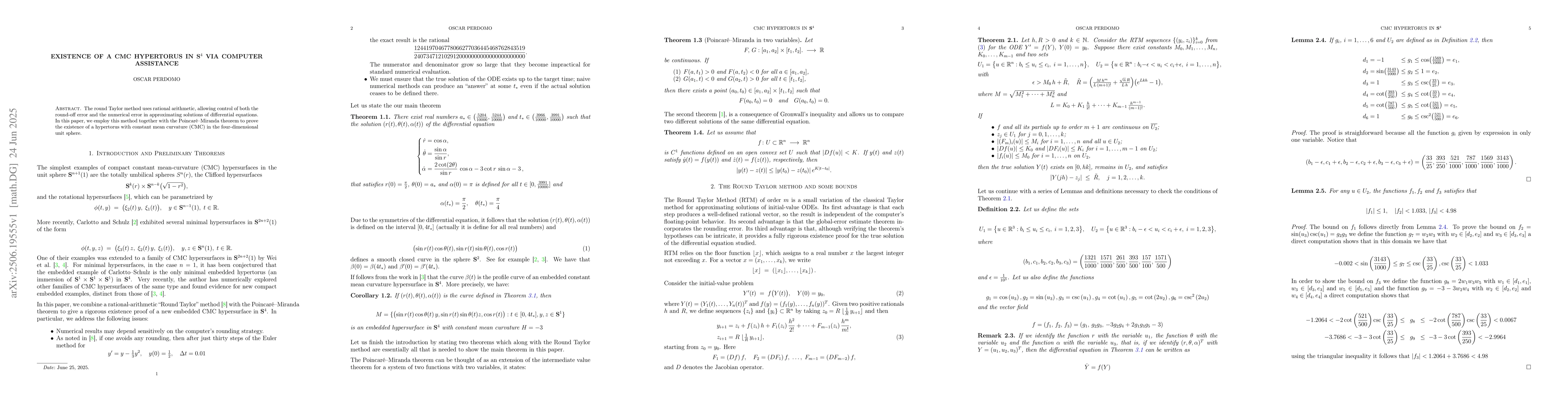 The round Taylor method uses rational arithmetic, allowing control of both round-off and truncation errors in approximating solutions of differential equations. In this paper, we employ this method together with the Poincare-Miranda theorem to prove the existence of a new embedded constant mean curvature (CMC) hypertorus in the unit four dimensional sphere