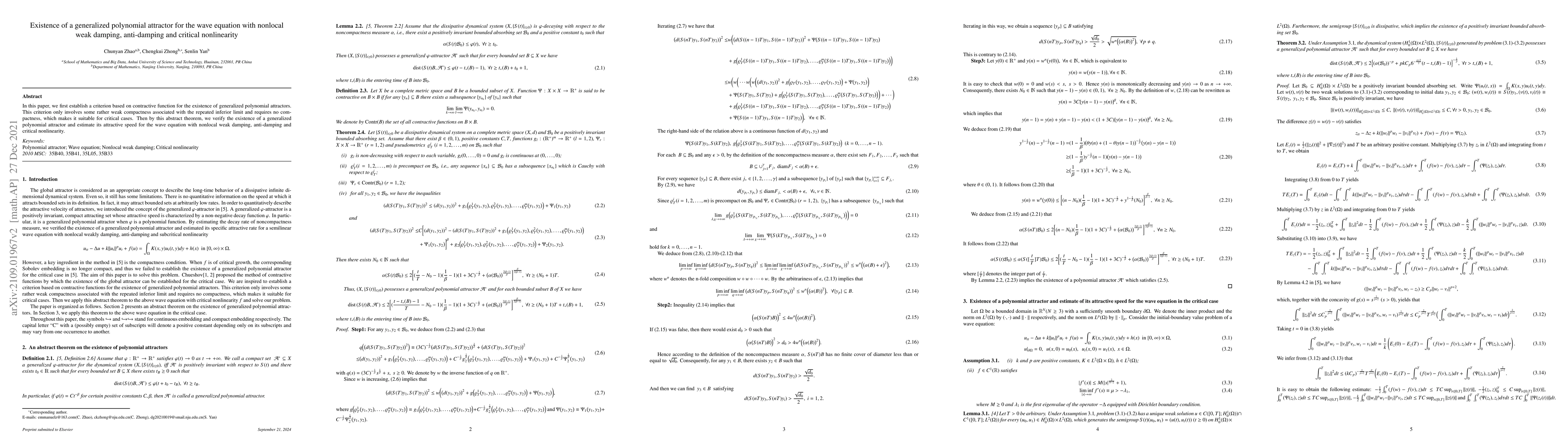 This paper establishes a criterion for the existence of polynomial attractors using contractive functions and weak compactness, then applies this criterion to prove the existence of such attractors for a wave equation featuring nonlocal weak damping, anti-damping, and critical nonlinearity.