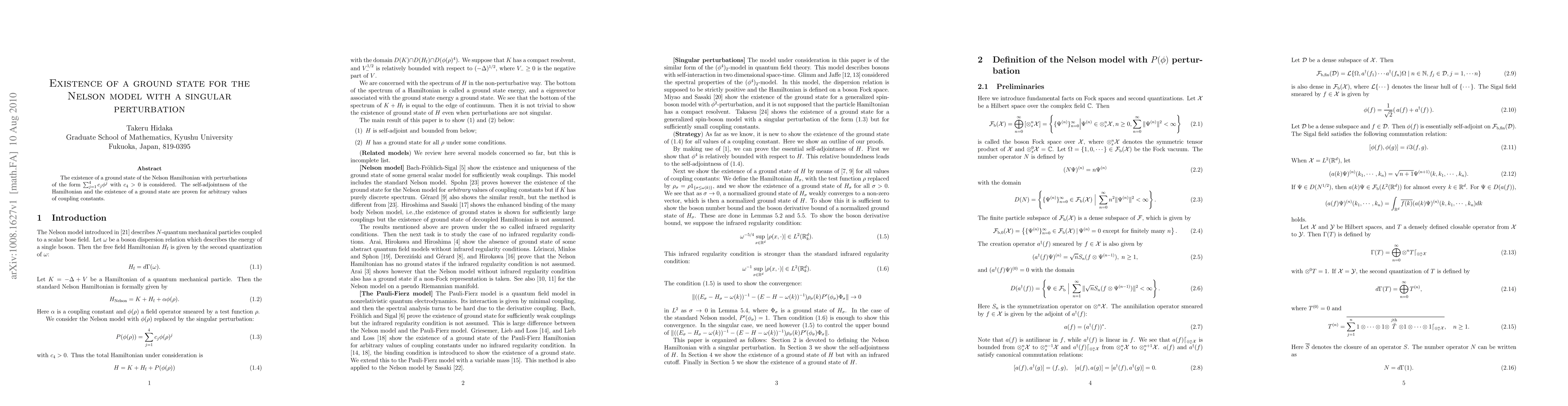 This paper proves the existence of a ground state for the Nelson model with a singular perturbation, regardless of coupling constants, using self-adjointness arguments.