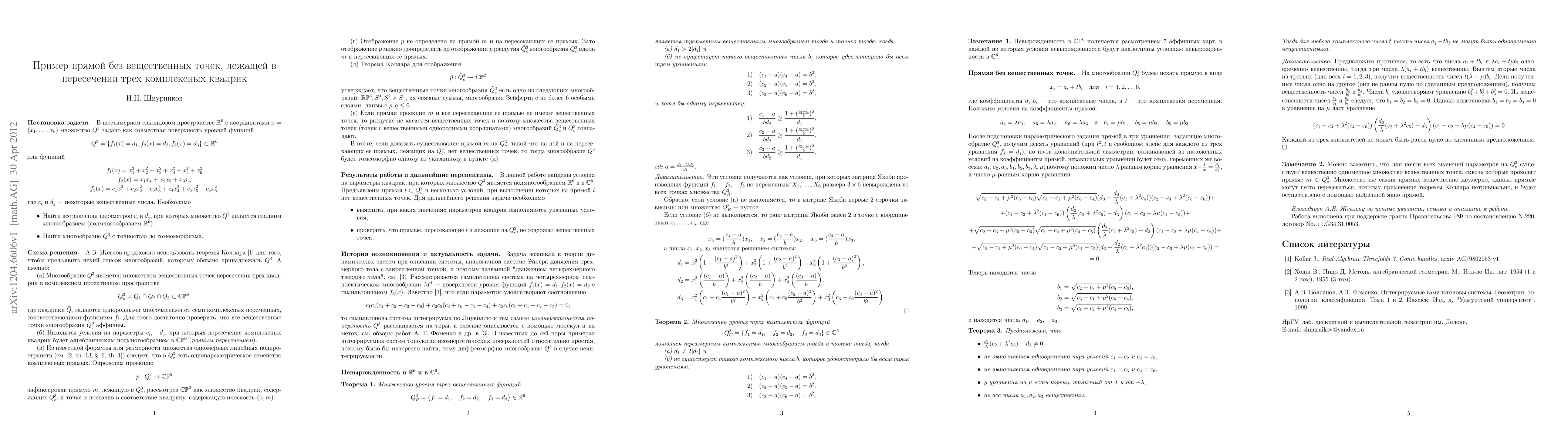 The paper establishes the existence of a line without real points in the complex projectivization of the intersection of three quadrics in Euclidean 6-space, using Kollar's results. This finding is a crucial step towards classifying all possible homeomorphism types of the resulting manifolds.