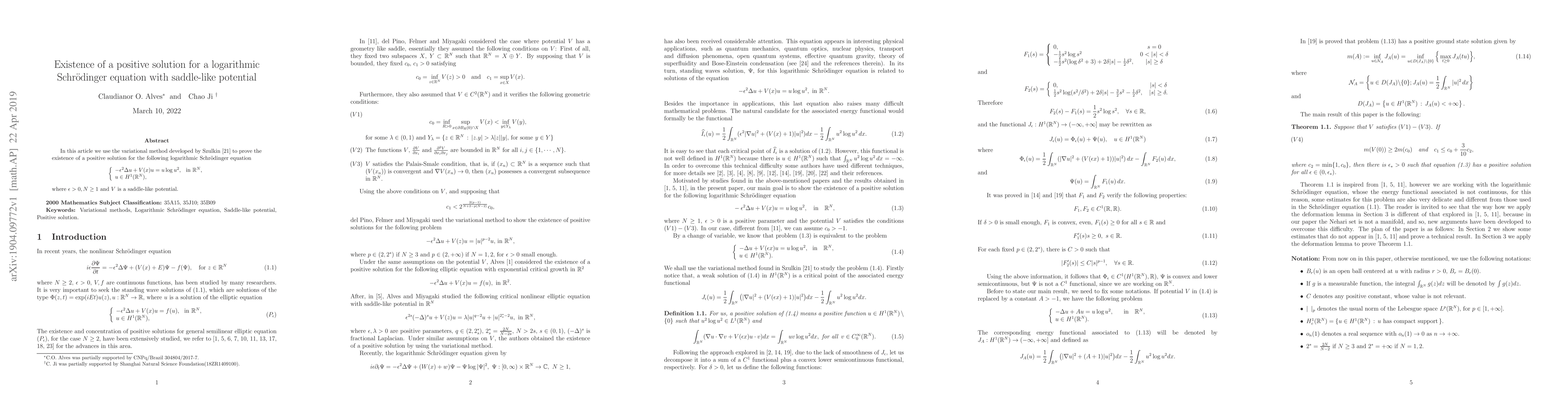 This paper proves the existence of a positive solution for a logarithmic Schrödinger equation using Szulkin's variational method, where the potential $V(x)$ is saddle-like. The solution is shown to exist in the Sobolev space $H^1(\mathbb{R}^{N})$.