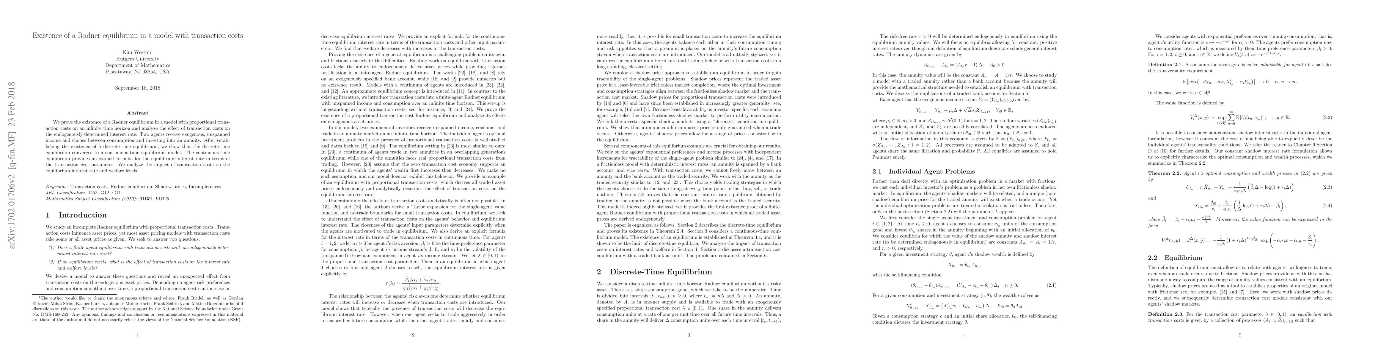 This paper proves the existence of a Radner equilibrium in a model with transaction costs and infinite time horizon, showing how these costs affect the interest rate and welfare. The study also demonstrates the convergence of a discrete-time equilibrium to a continuous-time model, providing an explicit formula for the equilibrium interest rate.
