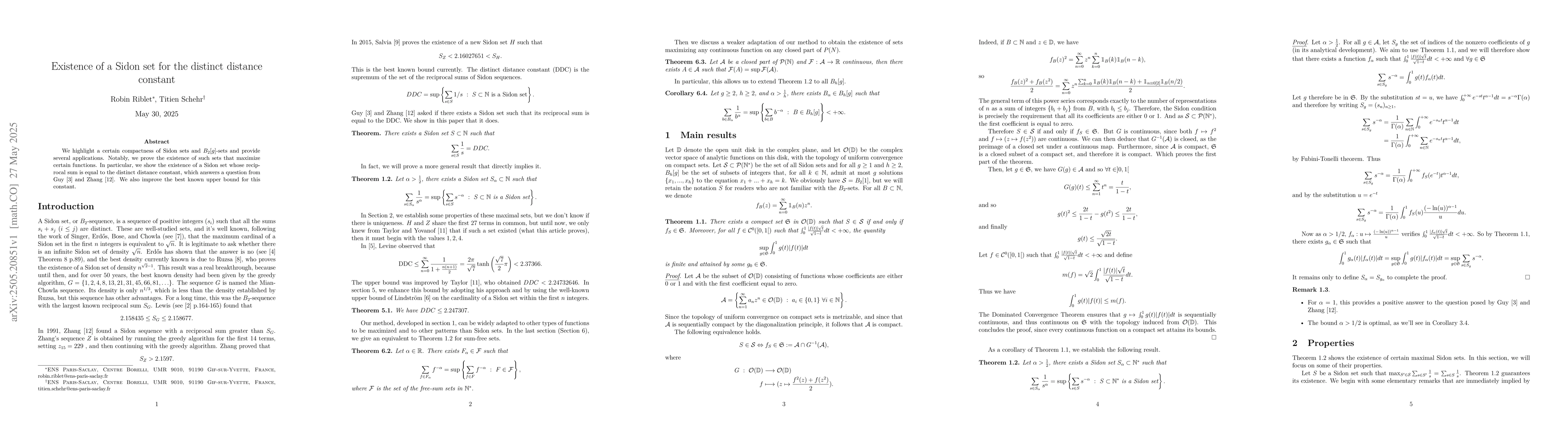 Researchers prove the existence of a Sidon set with a reciprocal sum equal to the distinct distance constant, improving the known upper bound for this constant.