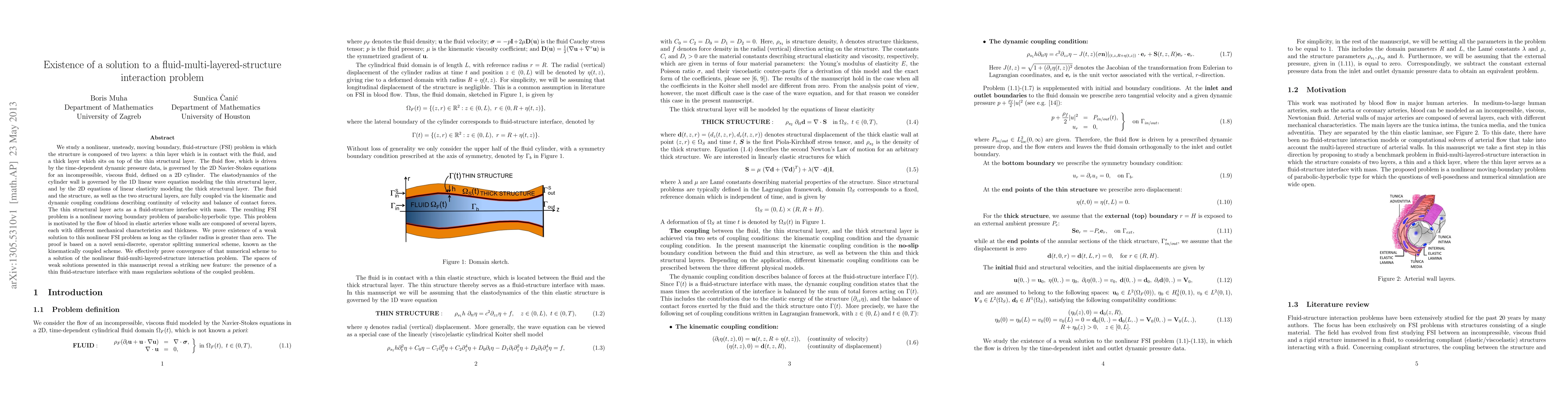 We study a nonlinear, unsteady, moving boundary, fluid-structure (FSI) problem in which the structure is composed of two layers: a thin layer which is in contact with the fluid, and a thick layer which sits on top of the thin structural layer. The fluid flow, which is driven by the time-dependent dynamic pressure data, is governed by the 2D Navier-Stokes equations for an incompressible, viscous fluid, defined on a 2D cylinder. The elastodynamics of the cylinder wall is governed by the 1D linear wave equation modeling the thin structural layer, and by the 2D equations of linear elasticity modeling the thick structural layer. The fluid and the structure, as well as the two structural layers, are fully coupled via the kinematic and dynamic coupling conditions describing continuity of velocity and balance of contact forces. The thin structural layer acts as a fluid-structure interface with mass. The resulting FSI problem is a nonlinear moving boundary problem of parabolic-hyperbolic type. This problem is motivated by the flow of blood in elastic arteries whose walls are composed of several layers, each with different mechanical characteristics and thickness. We prove existence of a weak solution to this nonlinear FSI problem as long as the cylinder radius is greater than zero. The proof is based on a novel semi-discrete, operator splitting numerical scheme, known as the kinematically coupled scheme. We effectively prove convergence of that numerical scheme to a solution of the nonlinear fluid-multi-layered-structure interaction problem. The spaces of weak solutions presented in this manuscript reveal a striking new feature: the presence of a thin fluid-structure interface with mass regularizes solutions of the coupled problem.