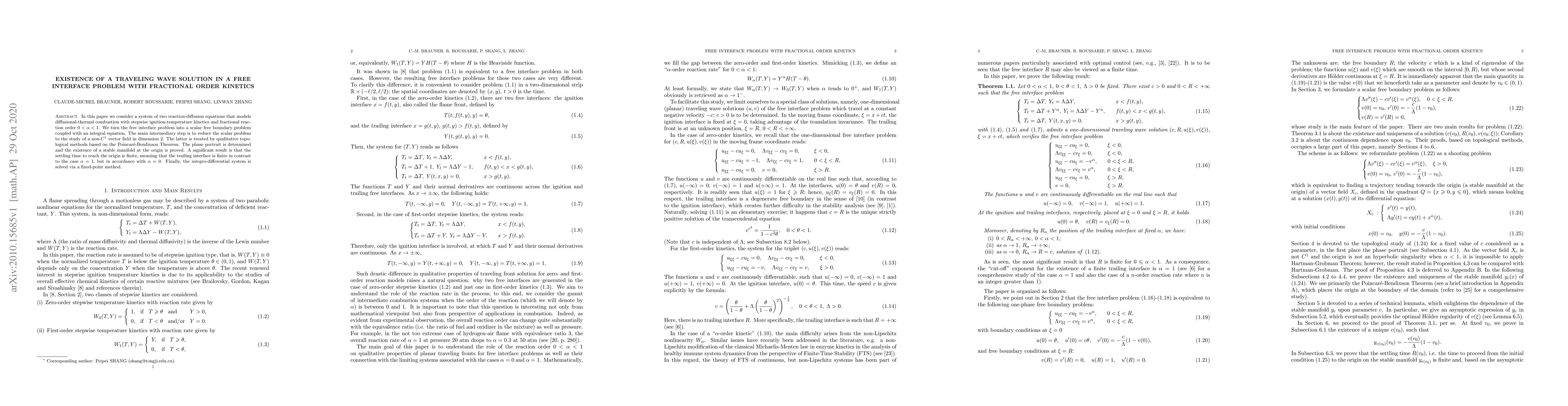 In this paper we consider a system of two reaction-diffusion equations that models diffusional-thermal combustion with stepwise ignition-temperature kinetics and fractional reaction order 0 < $\alpha$ < 1. We turn the free interface problem into a scalar free boundary problem coupled with an integral equation. The main intermediary step is to reduce the scalar problem to the study of a non-C 1 vector field in dimension 2. The latter is treated by qualitative topo-logical methods based on the Poincar{\'e}-Bendixson Theorem. The phase portrait is determined and the existence of a stable manifold at the origin is proved. A significant result is that the settling time to reach the origin is finite, meaning that the trailing interface is finite in contrast to the case $\alpha$ = 1, but in accordance with $\alpha$ = 0. Finally, the integro-differential system is solved via a fixed-point method.