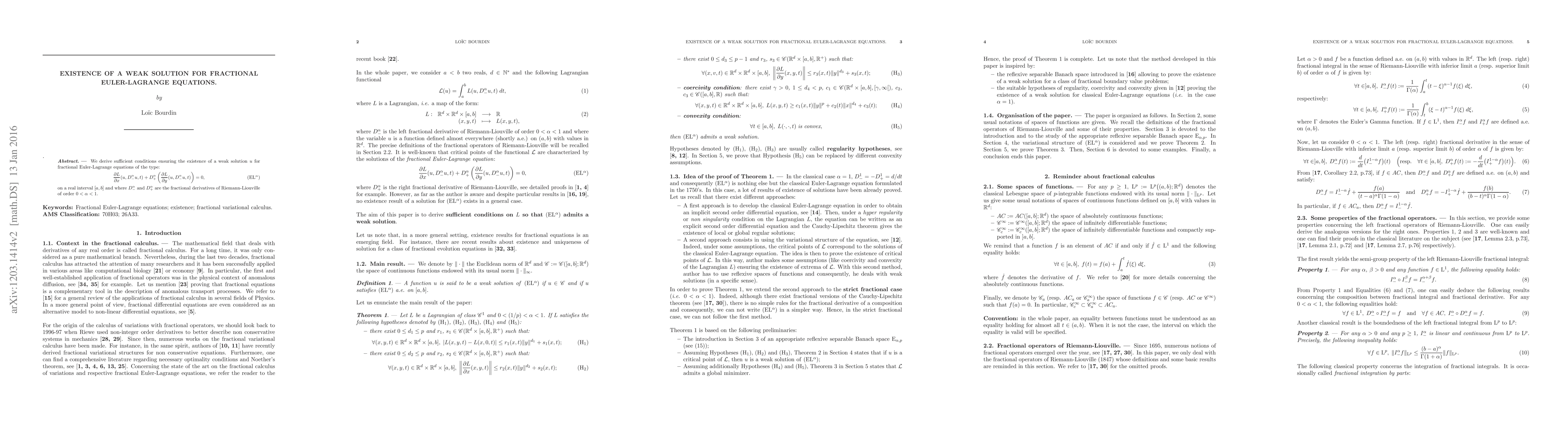 In this paper, we state with a variational method a general theorem providing the existence of a weak solution $u$ for fractional Euler-Lagrange equations of the type: $$ \dfrac{\partial L}{\partial x} (u,D^\alpha_- u,t) + D^\alpha_+ (\dfrac{\partial L}{\partial y} (u,D^\alpha_- u,t)) = 0 $$ on a real interval $[a,b]$ and where $D^\alpha_-$ and $D^\alpha_+$ are the fractional derivatives of Riemann-Liouville of order $0 < \alpha < 1$.