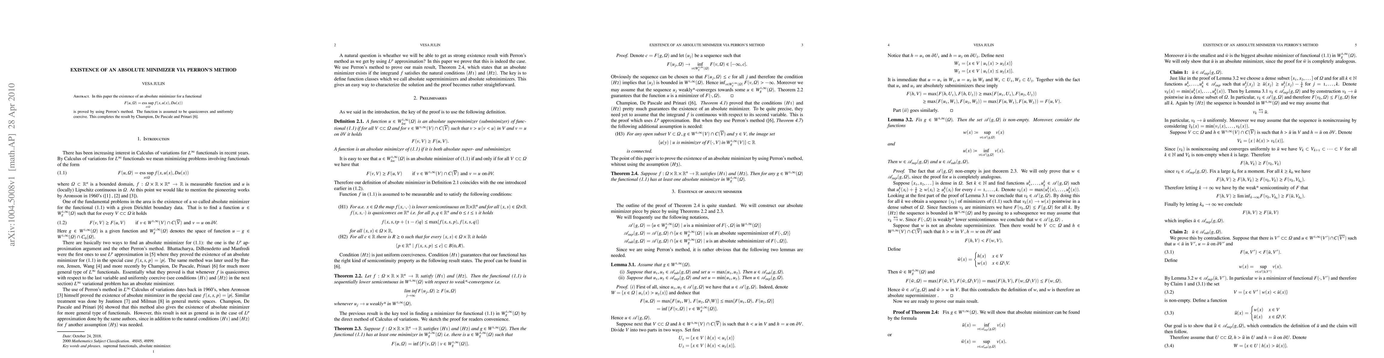 In this paper the existence of an absolute minimizer for a functional \[ F(u,\Omega) = \underset{x \in \Omega}{\text{ess sup}} \, f (x, u(x), Du(x)) \] is proved by using Perron's method. The function is assumed to be quasiconvex and uniformly coercive. This completes the result by Champion, De Pascale and Prinari.