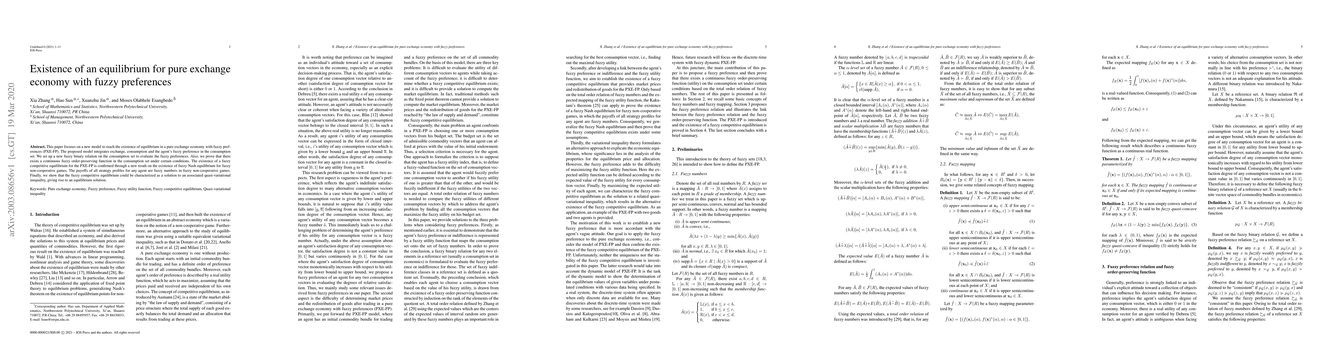 The paper proposes a new model for the existence of equilibrium in a pure exchange economy with fuzzy preferences (PXE-FP), integrating exchange, consumption, and agent fuzzy preferences using a new fuzzy binary relation on the consumption set. It proves the existence of a continuous fuzzy order-preserving function under certain conditions and confirms the existence of a fuzzy competitive equilibrium for PXE-FP through a fuzzy Nash equilibrium result.