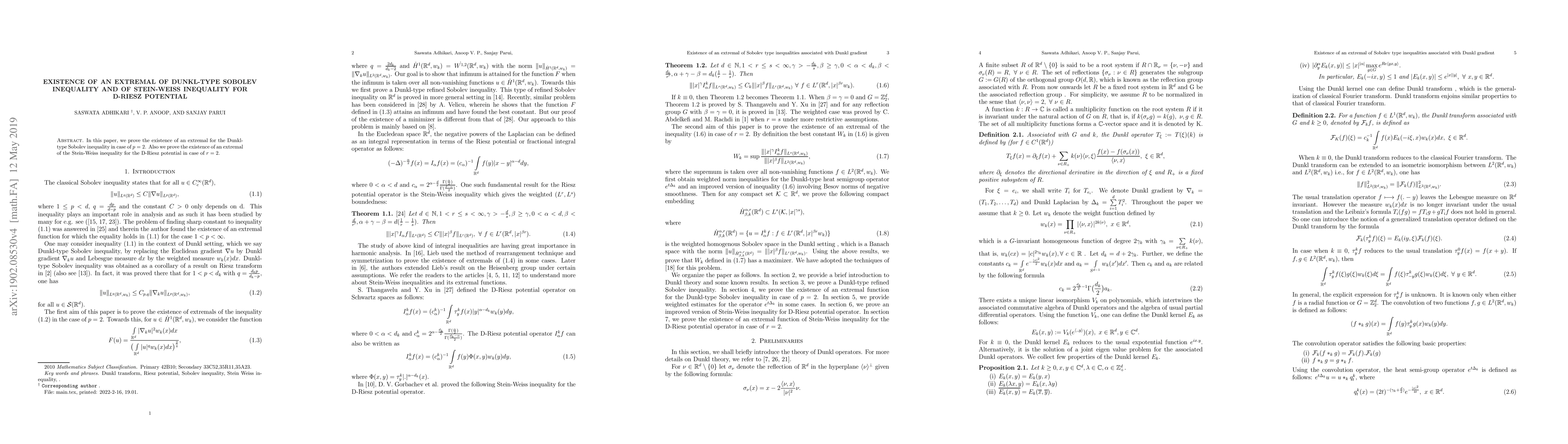 This paper establishes the existence of an extremal for the Dunkl-type Sobolev inequality when $p=2$ and for the Stein-Weiss inequality concerning the D-Riesz potential when $r=2$. The findings provide significant insights into the behavior of these inequalities under specific conditions.