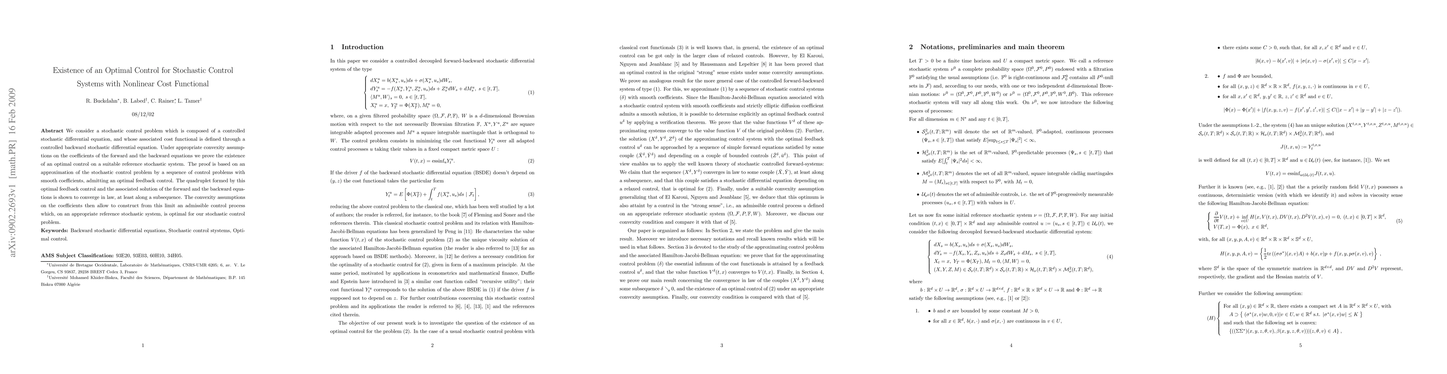 This paper proves the existence of an optimal control for stochastic systems with nonlinear cost functionals by approximating the problem with smooth coefficients and showing convergence of the optimal control quadruplet. Convexity assumptions on coefficients enable the construction of an optimal control on a reference stochastic system.