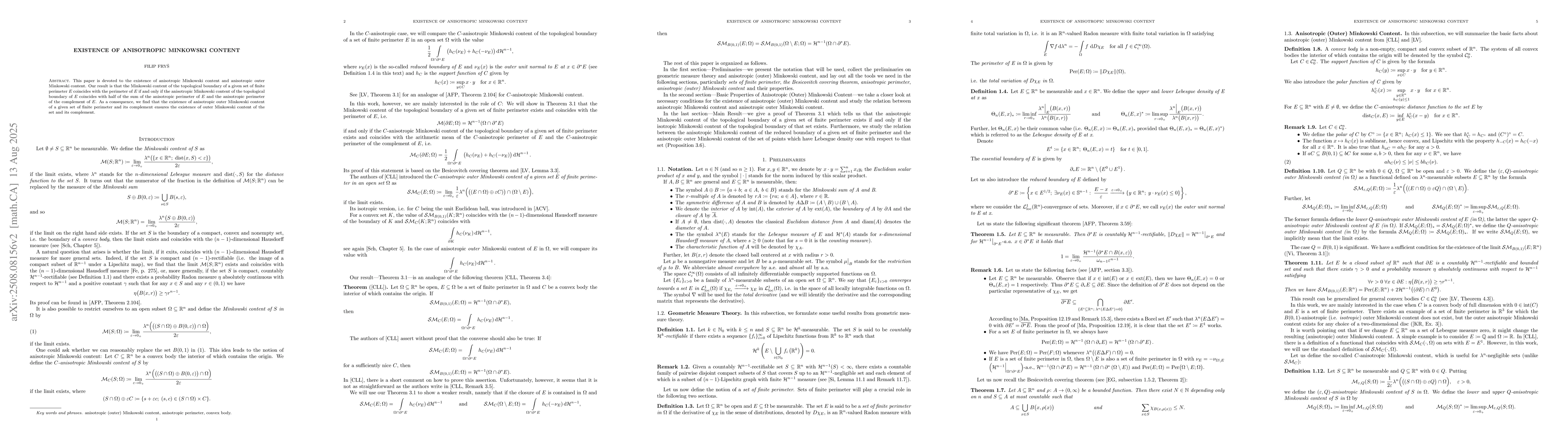 This paper is devoted to the existence of anisotropic Minkowski content and anisotropic outer Minkowski content. Our result is that the Minkowski content of the topological boundary of a given set of finite perimeter $E$ coincides with the perimeter of $E$ if and only if the anisotropic Minkowski content of the topological boundary of $E$ coincides with half of the sum of the anisotropic perimeter of $E$ and the anisotropic perimeter of the complement of $E.$ As a consequence, we find that the existence of anisotropic outer Minkowski content of a given set of finite perimeter and its complement ensures the existence of outer Minkowski content of the set and its complement.