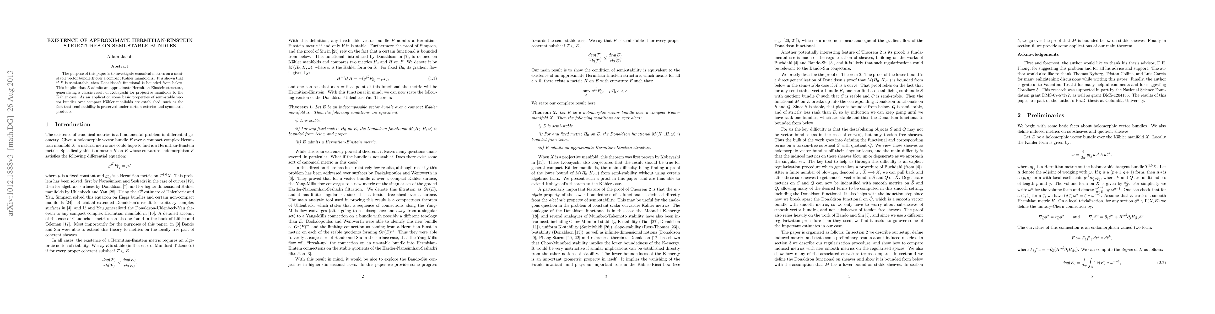 The purpose of this paper is to investigate canonical metrics on a semi-stable vector bundle E over a compact Kahler manifold X. It is shown that, if E is semi-stable, then Donaldson's functional is bounded from below. This implies that E admits an approximate Hermitian-Einstein structure, generalizing a classic result of Kobayashi for projective manifolds to the Kahler case. As an application some basic properties of semi-stable vector bundles over compact Kahler manifolds are established, such as the fact that semi-stability is preserved under tensor product and certain exterior and symmetric products.