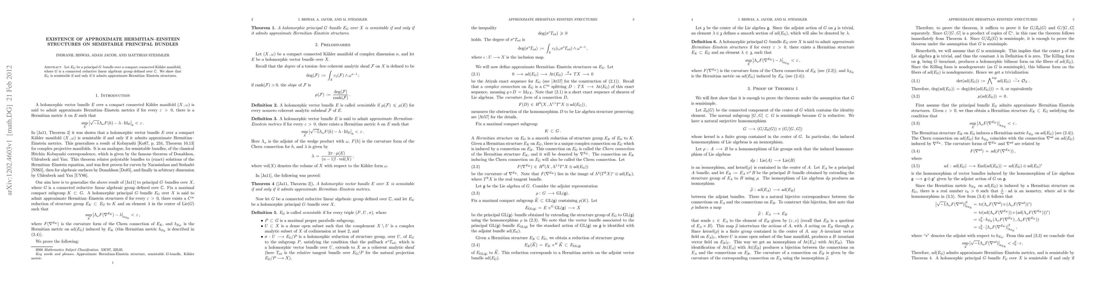 Summary: The paper proves that a principal G-bundle over a compact Kähler manifold is semistable if and only if it possesses approximate Hermitian-Einstein structures, establishing a connection between stability and approximate Hermitian-Einstein metrics.