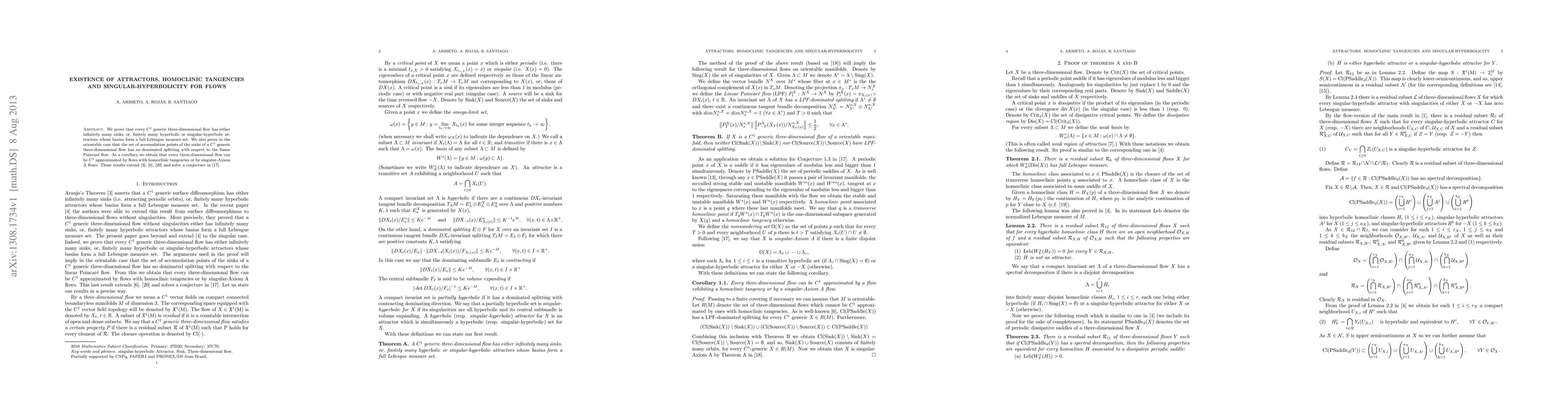 We prove that every $C^1$ generic three-dimensional flow has either infinitely many sinks, or, infinitely many hyperbolic or singular-hyperbolic attractors whose basins form a full Lebesgue measure set. We also prove in the orientable case that the set of accumulation points of the sinks of a $C^1$ generic three-dimensional flow has no dominated splitting with respect to the linear Poincar\'e flow. As a corollary we obtain that every three-dimensional flow can be $C^1$ approximated by flows with homoclinic tangencies or by singular-Axiom A flows.