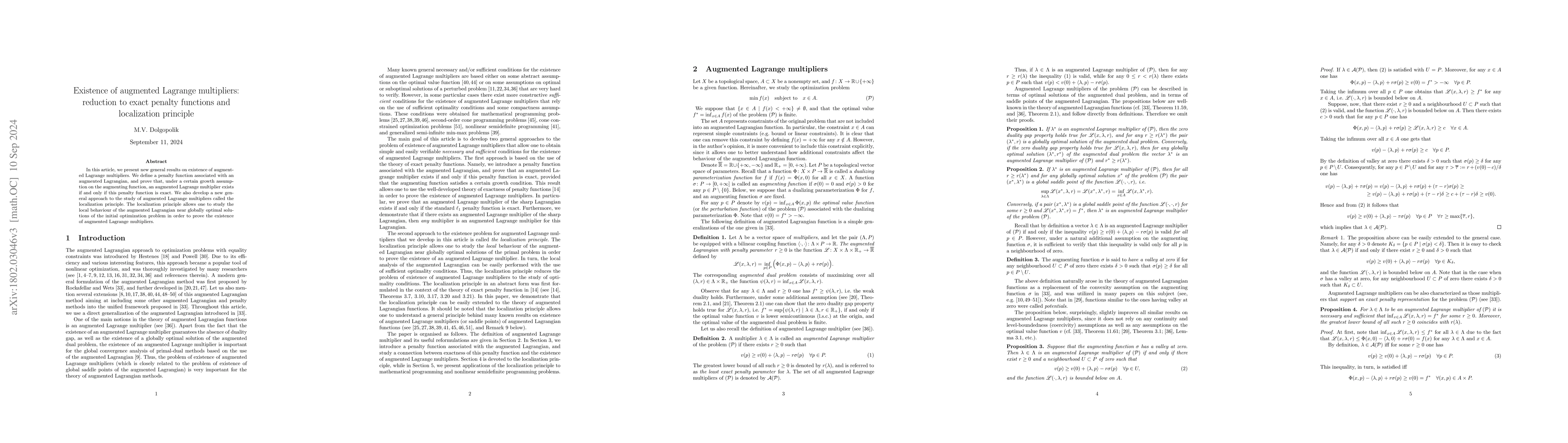 This paper establishes the existence of augmented Lagrange multipliers through the exactness of associated penalty functions and introduces a localization principle to study their local behavior near optimal solutions. The localization principle aids in proving the existence of these multipliers.