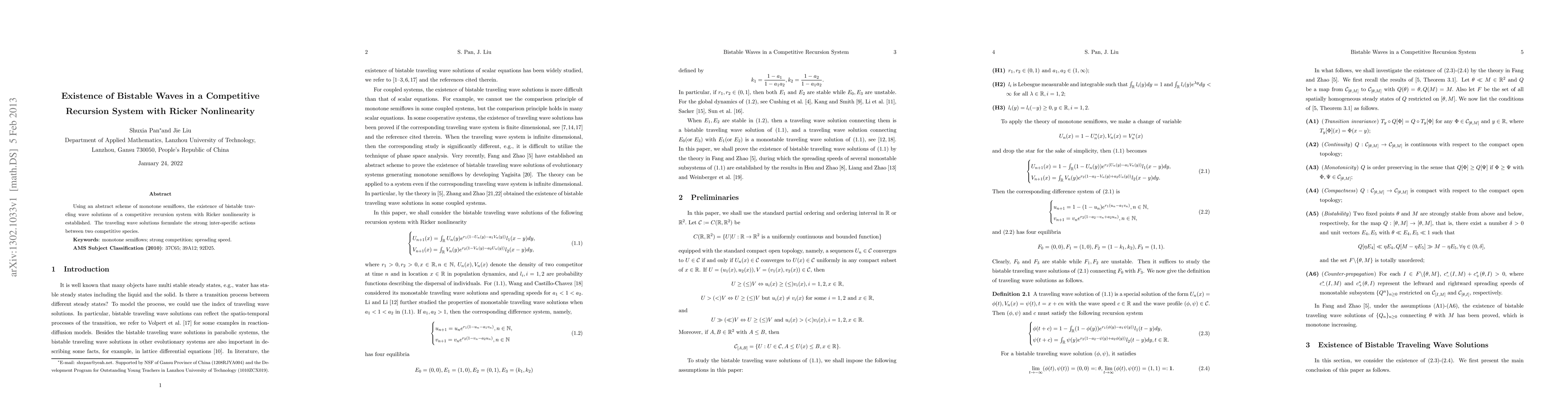 Summary: This paper establishes the existence of bistable traveling wave solutions in a competitive recursion system featuring Ricker nonlinearity, using monotone semiflows. These solutions model the strong inter-specific interactions between two competing species.