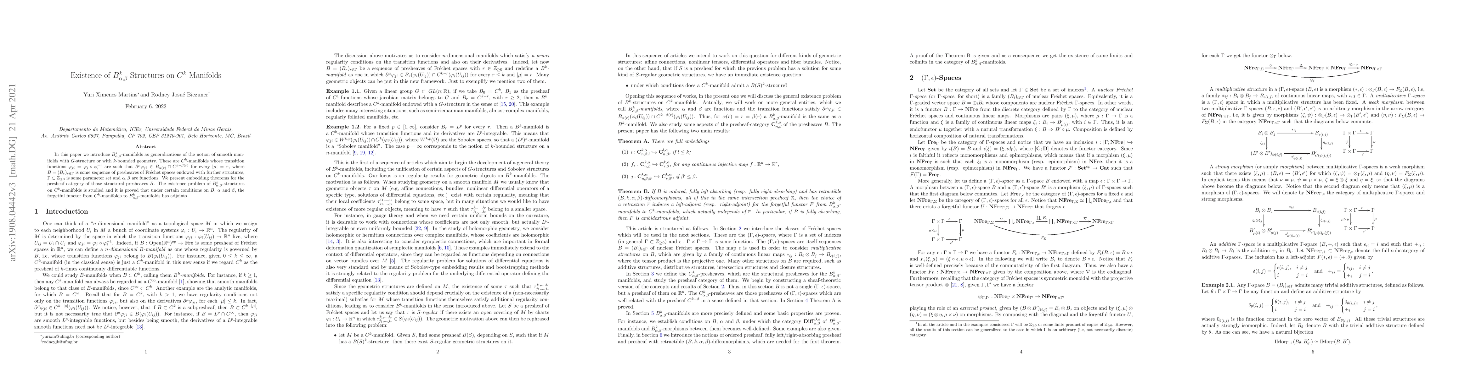 In this paper we introduce $B_{\alpha,\beta}^{k}$-manifolds as generalizations of the notion of smooth manifolds with $G$-structure or with $k$-bounded geometry. These are $C^{k}$-manifolds whose transition functions $\varphi_{ji}=\varphi_{j}\circ\varphi_{i}^{-1}$ are such that $\partial^{\mu}\varphi_{ji}\in B_{\alpha(r)}\cap C^{k-\beta(r)}$ for every $\vert\mu\vert=r$, where $B=(B_{r})_{r\in\Gamma}$ is some sequence of presheaves of Fr\'echet spaces endowed with further structures, $\Gamma\subset\mathbb{Z}_{\geq0}$ is some parameter set and $\alpha,\beta$ are functions. We present embedding theorems for the presheaf category of those structural presheaves $B$. The existence problem of $B_{\alpha,\beta}^{k}$-structures on $C^{k}$-manifolds is studied and it is proved that under certain conditions on $B$, $\alpha$ and $\beta$, the forgetful functor from $C^{k}$-manifolds to $B_{\alpha,\beta}^{k}$-manifolds has adjoints.