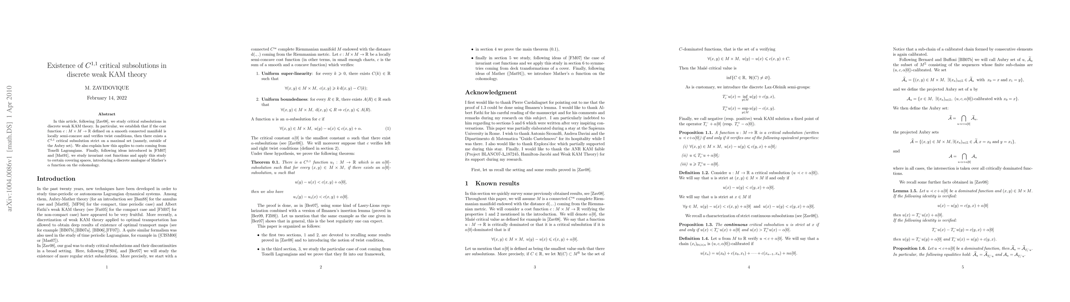 This paper establishes the existence of $C^{1,1}$ critical subsolutions in discrete weak KAM theory for locally semi-concave cost functions satisfying twist conditions, extending results to costs from Tonelli Lagrangians and introducing a discrete analogue of Mather's $\alpha$ function on cohomology.
