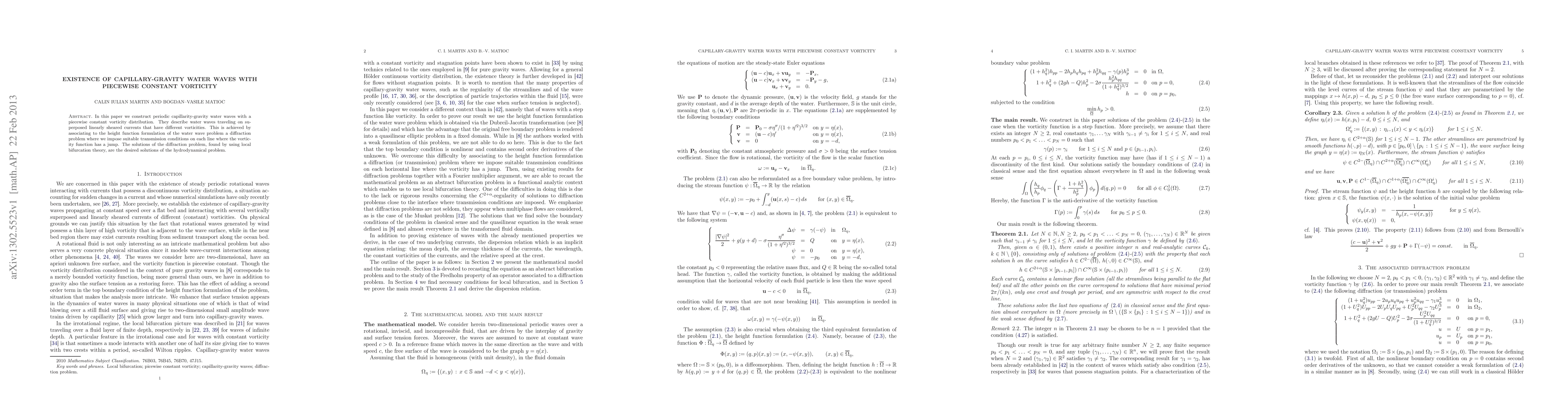 This paper constructs periodic capillary-gravity water waves with piecewise constant vorticity, describing waves on superposed sheared currents with different vorticities. It uses local bifurcation theory to solve a diffraction problem with transmission conditions at vorticity jump lines.