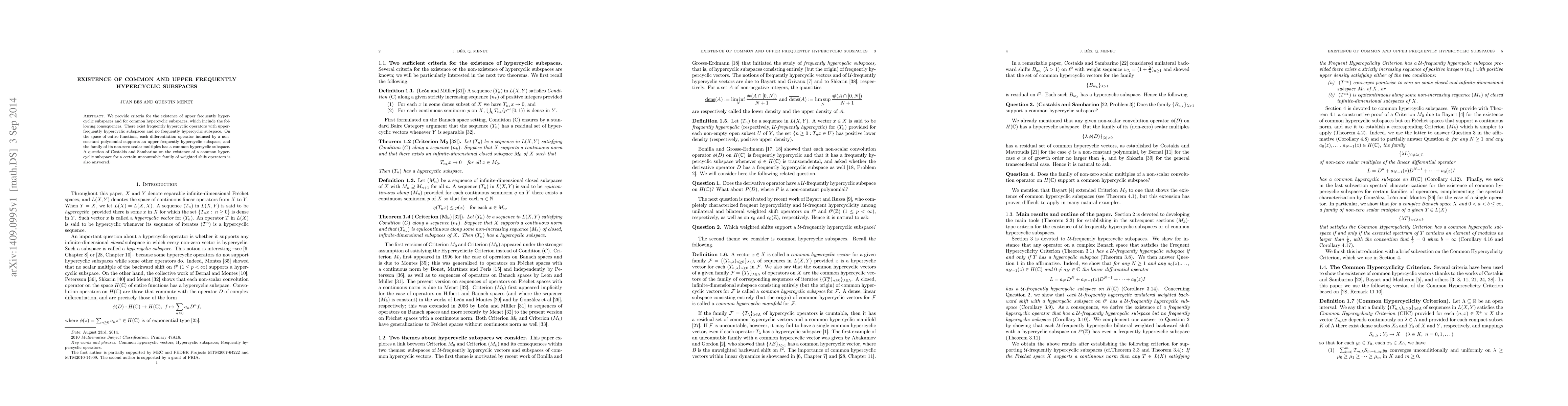 We provide criteria for the existence of upper frequently hypercyclic subspaces and for common hypercyclic subspaces, which include the following consequences. There exist frequently hypercyclic operators with upper-frequently hypercyclic subspaces and no frequently hypercyclic subspace. On the space of entire functions, each differentiation operator induced by a non-constant polynomial supports an upper frequently hypercyclic subspace, and the family of its non-zero scalar multiples has a common hypercyclic subspace. A question of Costakis and Sambarino on the existence of a common hypercyclic subspace for a certain uncountable family of weighted shift operators is also answered.