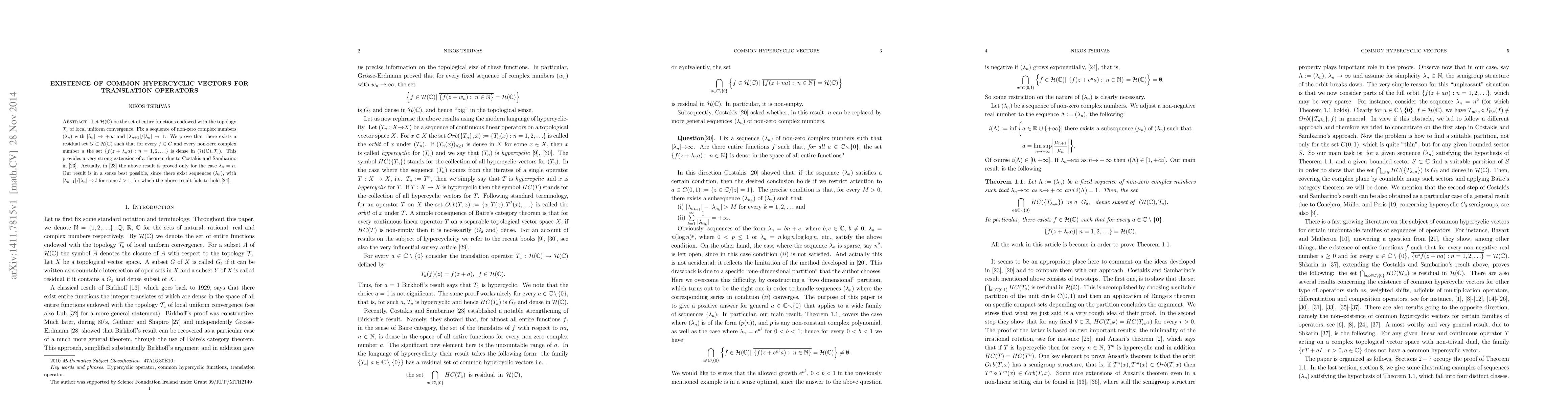 We prove the existence of common hypercyclic, entire functions for certain families of translation operators.