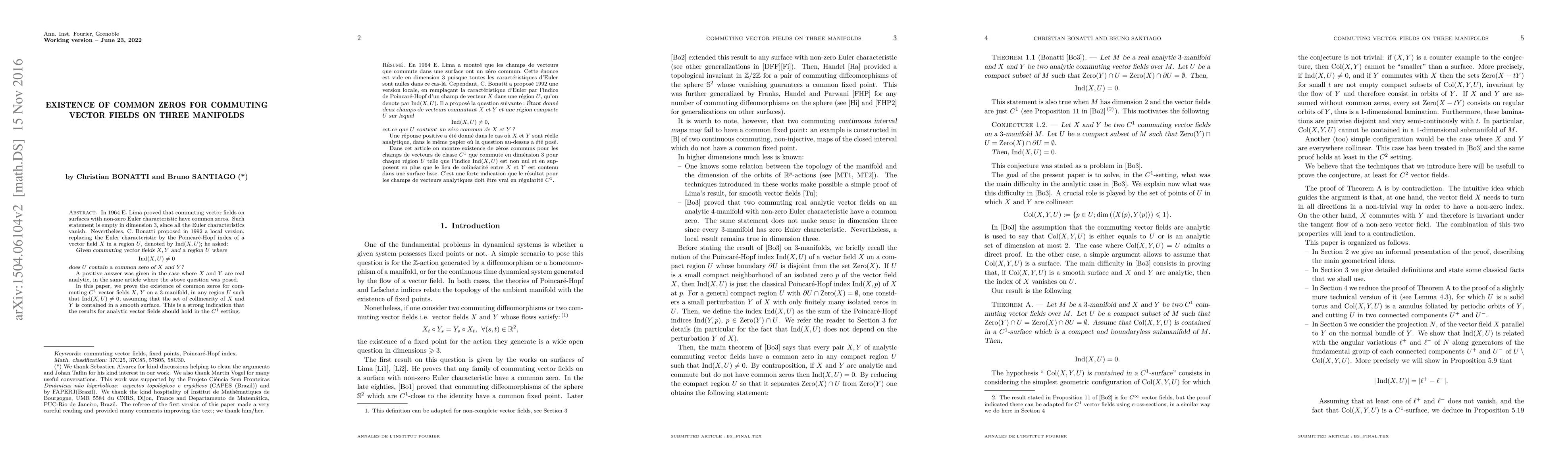 This paper proves that commuting $C^1$ vector fields on 3-manifolds have common zeros in regions with non-zero Poincaré-Hopf index, assuming a smooth set of collinearity.