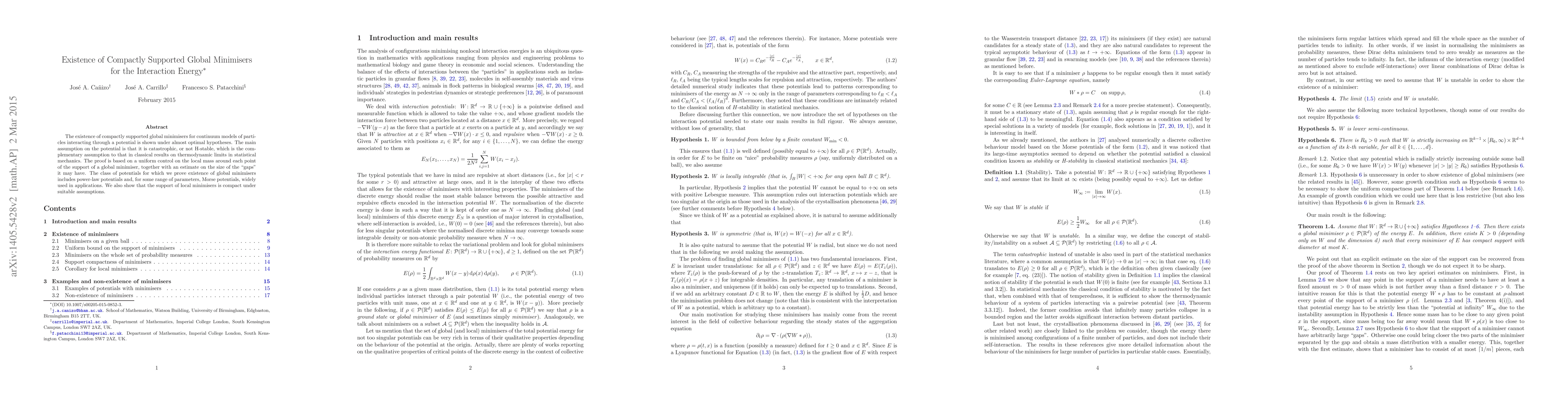 The existence of compactly supported global minimisers for continuum models of particles interacting through a potential is shown under almost optimal hypotheses. The main assumption on the potential is that it is catastrophic, or not H-stable, which is the complementary assumption to that in classical results on thermodynamic limits in statistical mechanics. The proof is based on a uniform control on the local mass around each point of the support of a global minimiser, together with an estimate on the size of the "gaps" it may have. The class of potentials for which we prove existence of global minimisers includes power-law potentials and, for some range of parameters, Morse potentials, widely used in applications. We also show that the support of local minimisers is compact under suitable assumptions.