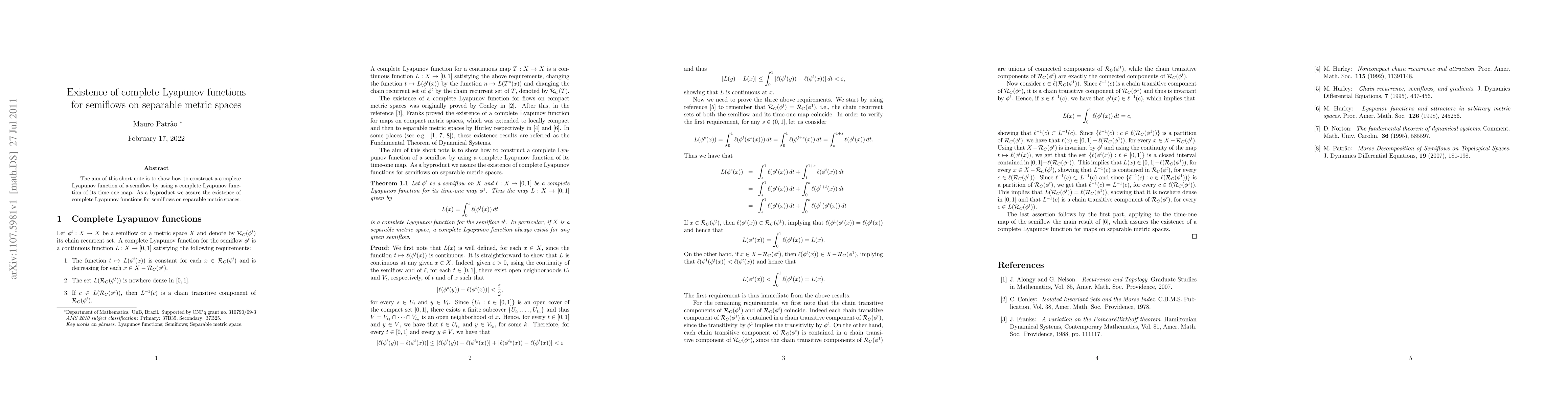 Summary: This paper demonstrates the construction of a complete Lyapunov function for semiflows using the time-one map's Lyapunov function, thereby confirming the existence of such functions for semiflows on separable metric spaces.