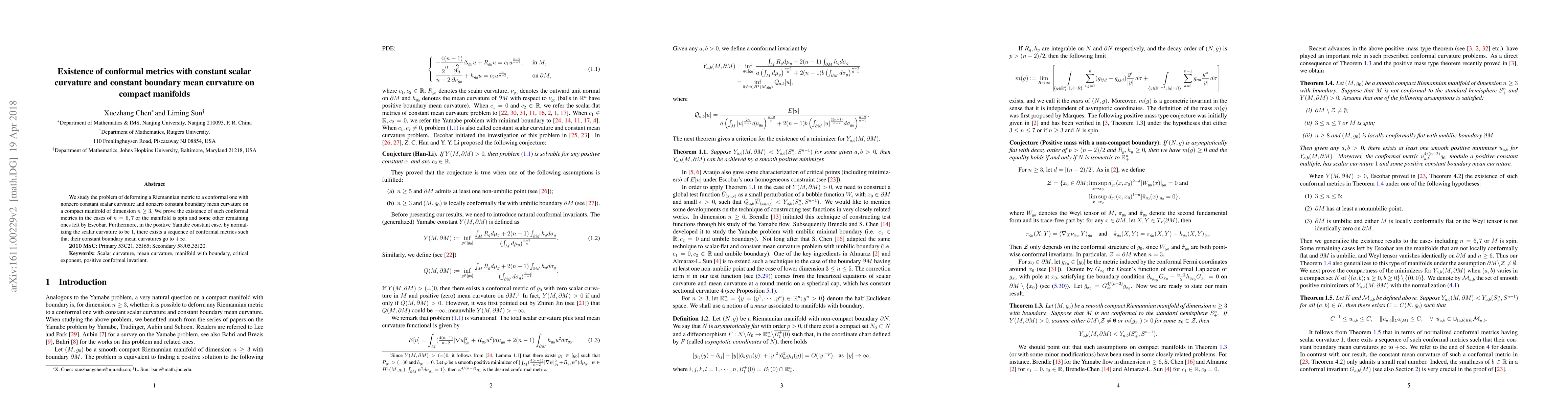 This paper proves the existence of conformal metrics with constant scalar curvature and constant boundary mean curvature on compact manifolds, particularly for $n=6,7$ or when the manifold is spin. It also shows that for manifolds with a positive Yamabe constant, a sequence of such conformal metrics can be normalized to have boundary mean curvatures tending to infinity.