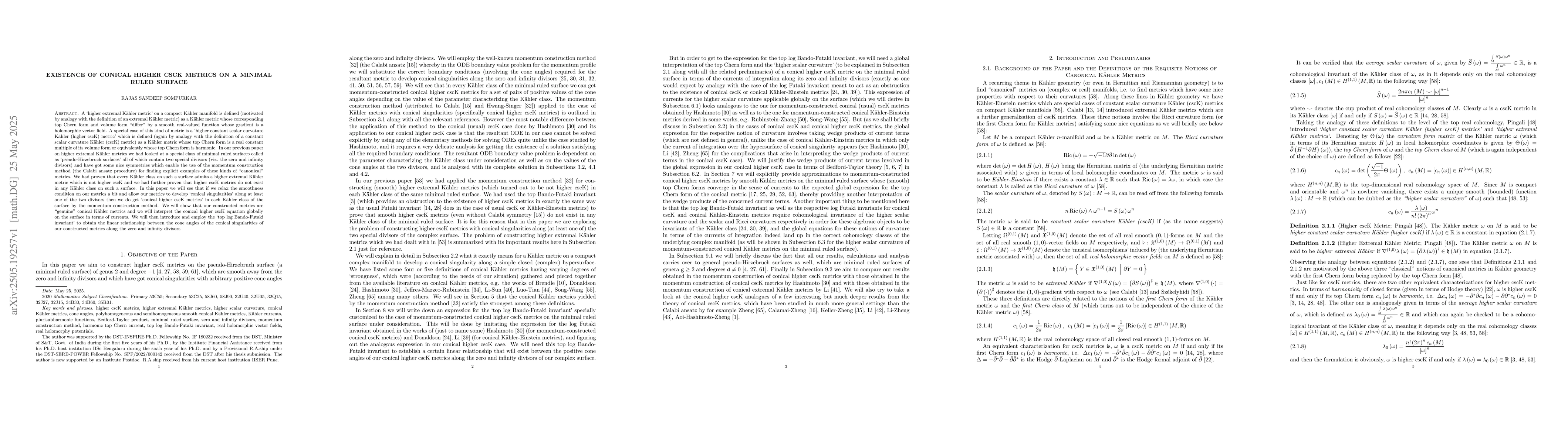 The paper introduces the concept of conical higher cscK metrics on minimal ruled surfaces and demonstrates their existence via the momentum construction method, along with a global interpretation of the conical higher cscK equation in terms of currents and the use of the top $\log$ Bando-Futaki invariant.