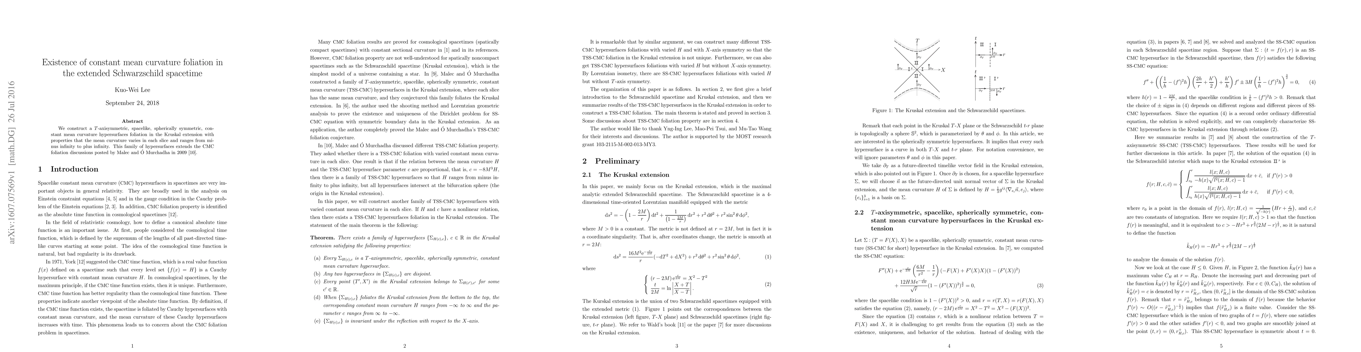 Summary: The paper constructs a $T$-axisymmetric, spacelike, spherically symmetric foliation of constant mean curvature hypersurfaces in the Kruskal extension of the Schwarzschild spacetime, with varying mean curvature ranging from negative to positive infinity, extending previous discussions by Malec and Ó Murchadha.