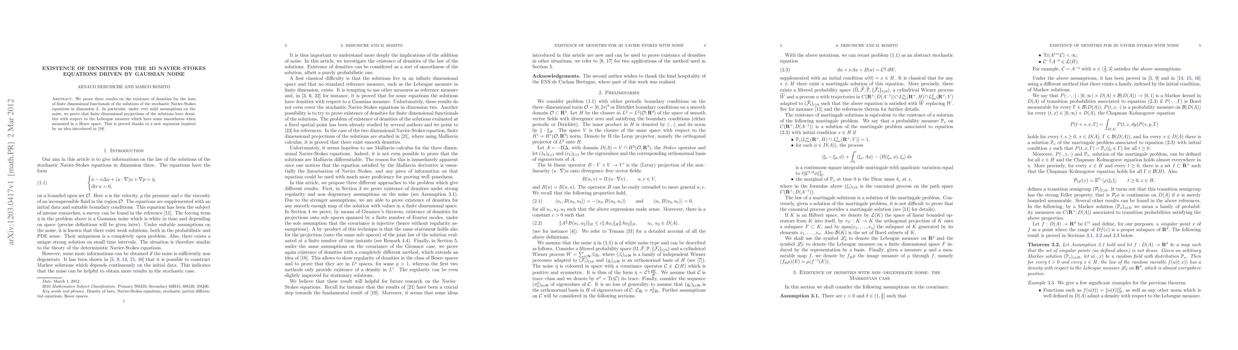 This paper proves the existence of densities for finite-dimensional projections of solutions to the 3D stochastic Navier-Stokes equations driven by Gaussian noise, demonstrating smoothness in a Besov space, using a novel argument inspired by Fournier and Printems (2010).
