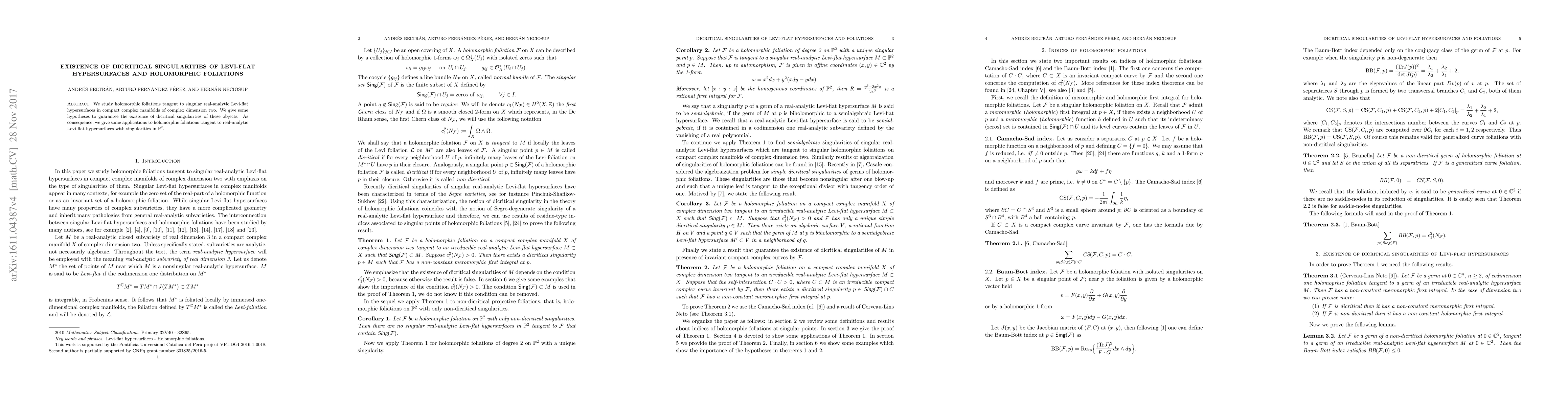 This paper investigates holomorphic foliations on Levi-flat hypersurfaces in complex manifolds, establishing conditions for the existence of dicritical singularities. It provides applications to foliations in $\mathbb{P}^2$ tangent to such hypersurfaces.