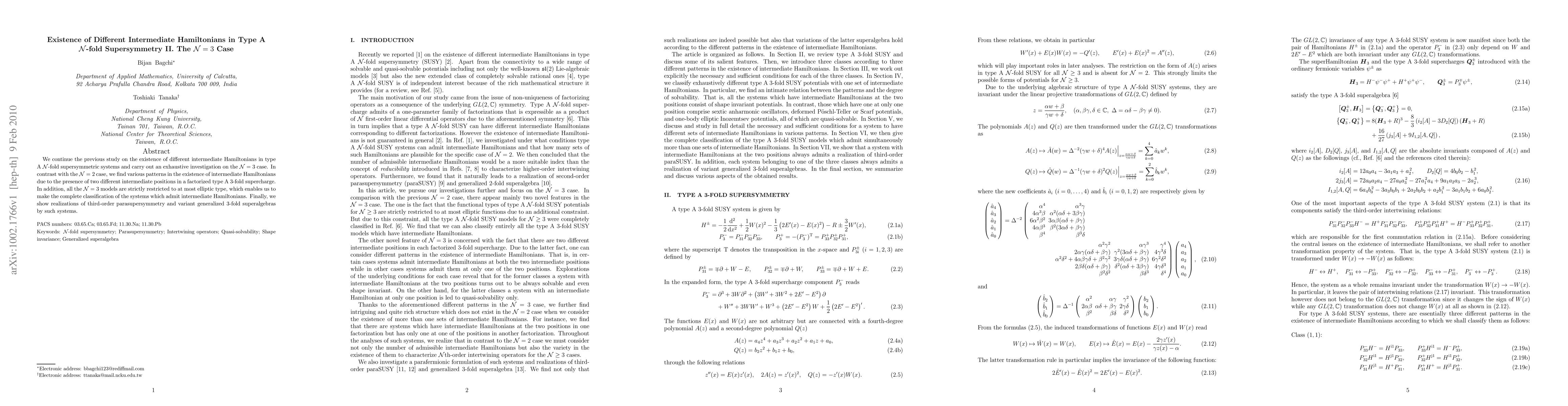 We continue the previous study on the existence of different intermediate Hamiltonians in type A N-fold supersymmetric systems and carry out an exhaustive investigation on the N=3 case. In contrast with the N=2 case, we find various patterns in the existence of intermediate Hamiltonians due to the presence of two different intermediate positions in a factorized type A 3-fold supercharge. In addition, all the N=3 models are strictly restricted to at most elliptic type, which enables us to make the complete classification of the systems which admit intermediate Hamiltonians. Finally, we show realizations of third-order parasupersymmetry and variant generalized 3-fold superalgebras by such systems.