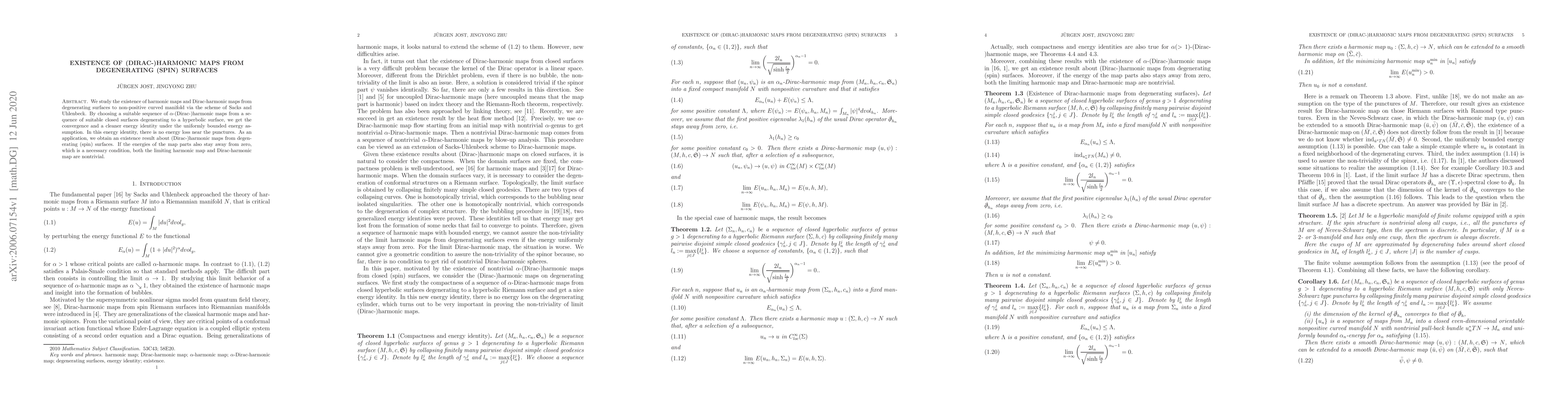 This paper investigates the existence of harmonic and Dirac-harmonic maps from degenerating surfaces to non-positively curved manifolds using a method by Sacks and Uhlenbeck. It demonstrates convergence of these maps and derives an energy identity without energy loss near punctures, ultimately proving the existence of nontrivial (Dirac-)harmonic maps under certain energy conditions.