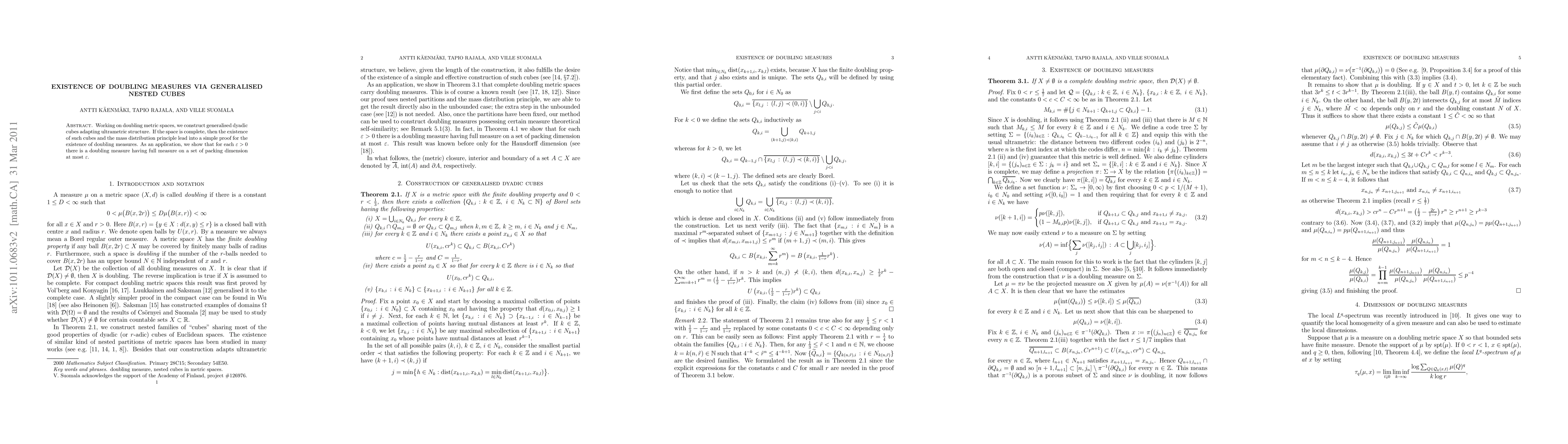 This paper constructs generalised nested cubes in complete doubling metric spaces, proving the existence of doubling measures. It demonstrates that for any $\epsilon > 0$, a doubling measure can be found with full measure on sets of packing dimension at most $\epsilon$.
