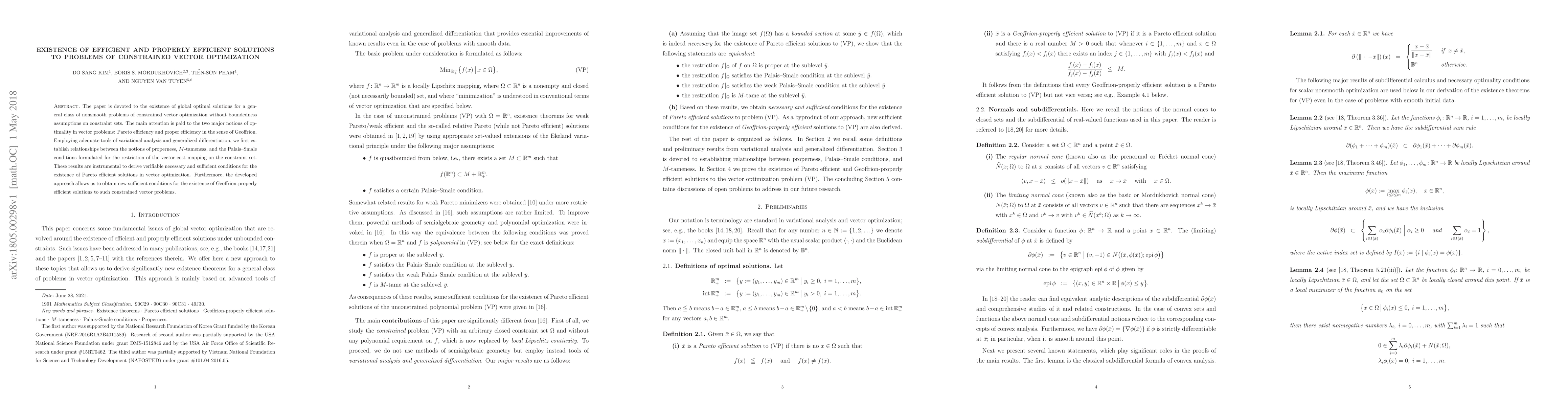 This paper investigates the existence of global optimal solutions for nonsmooth constrained vector optimization problems without boundedness assumptions on constraint sets. It establishes relationships between proper efficiency, $M$-tameness, and Palais-Smale conditions, providing necessary and sufficient conditions for Pareto efficiency and new sufficient conditions for Geoffrion-proper efficiency.