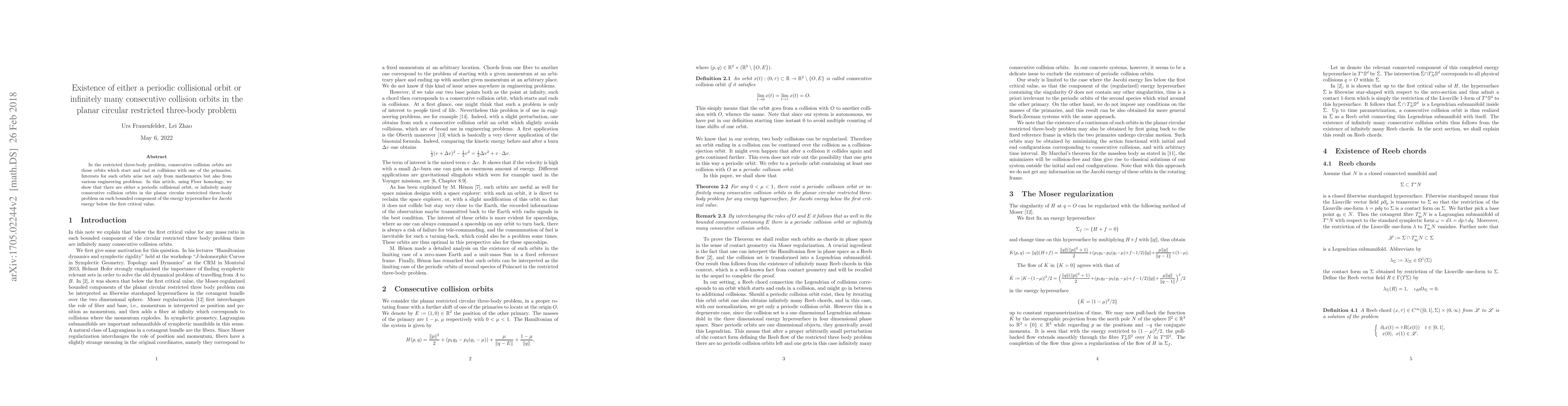 This paper demonstrates that in the planar circular restricted three-body problem, for Jacobi energies below the first critical value, either a periodic collisional orbit exists or there are infinitely many consecutive collision orbits using Floer homology. This result has implications for both mathematical and engineering applications involving the three-body problem.