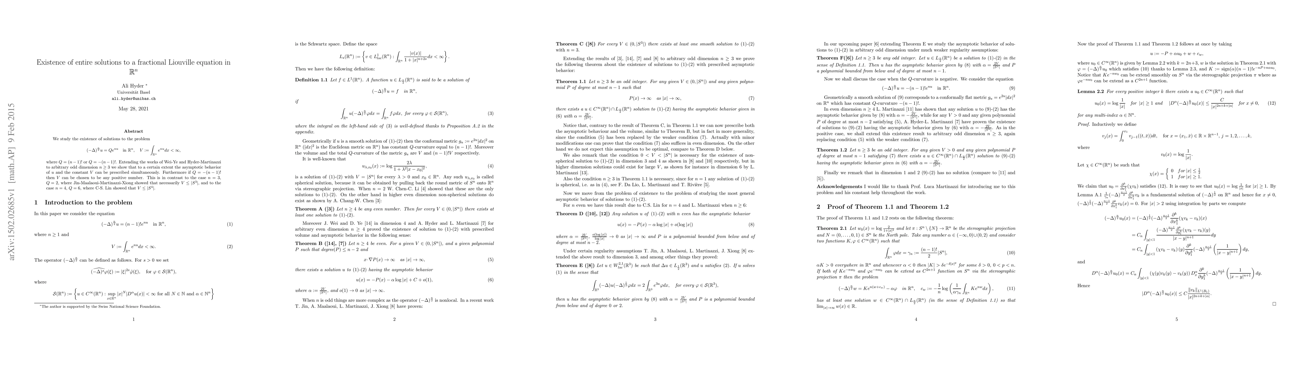 This paper investigates solutions to a fractional Liouville equation in R^n and shows that for odd dimensions n >= 3, the asymptotic behavior of u can be prescribed simultaneously with V, allowing for a wide range of values.
