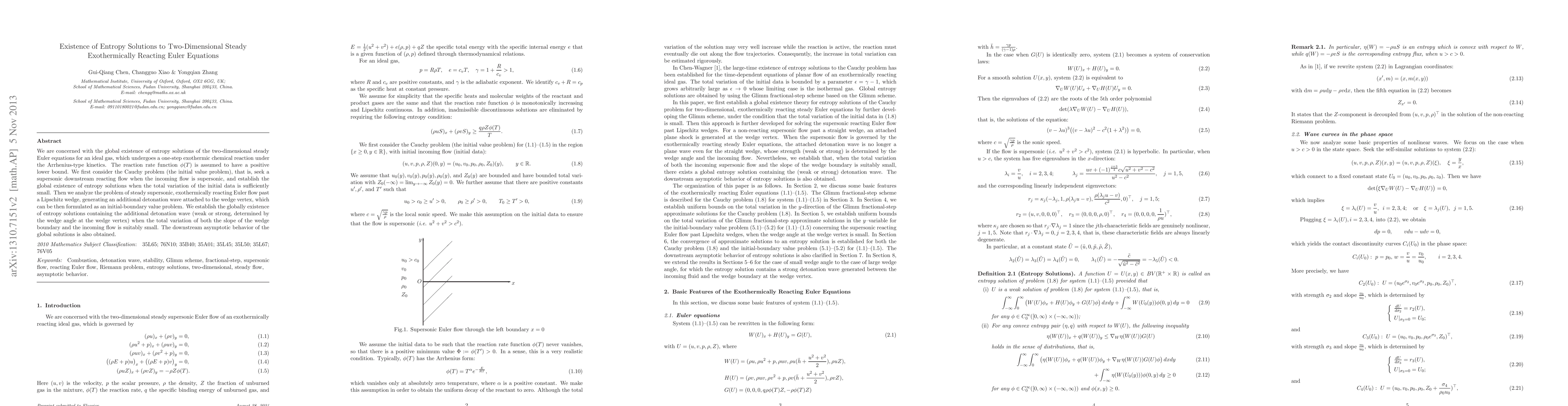 We are concerned with the global existence of entropy solutions of the two-dimensional steady Euler equations for an ideal gas, which undergoes a one-step exothermic chemical reaction under the Arrhenius-type kinetics. The reaction rate function $\phi(T)$ is assumed to have a positive lower bound. We first consider the Cauchy problem (the initial value problem), that is, seek a supersonic downstream reacting flow when the incoming flow is supersonic, and establish the global existence of entropy solutions when the total variation of the initial data is sufficiently small. Then we analyze the problem of steady supersonic, exothermically reacting Euler flow past a Lipschitz wedge, generating an additional detonation wave attached to the wedge vertex, which can be then formulated as an initial-boundary value problem. We establish the globally existence of entropy solutions containing the additional detonation wave (weak or strong, determined by the wedge angle at the wedge vertex) when the total variation of both the slope of the wedge boundary and the incoming flow is suitably small. The downstream asymptotic behavior of the global solutions is also obtained.